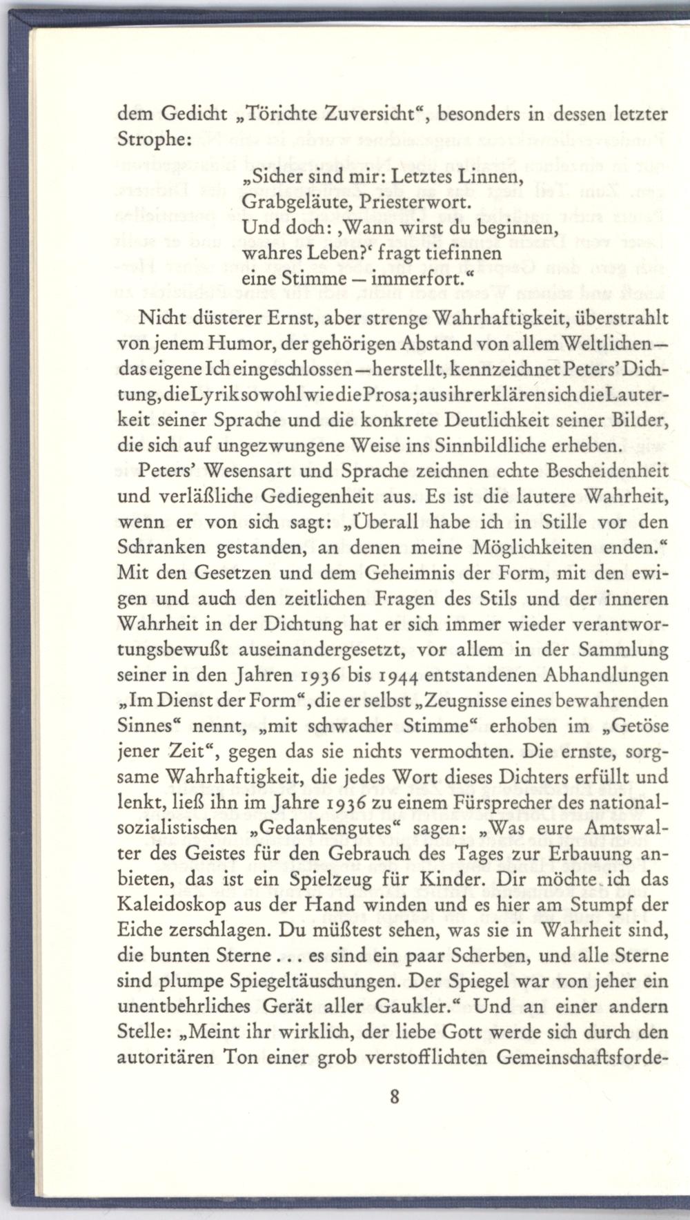 Peters’ Wesensart und Sprache zeichnen echte Bescheidenheit und verläßliche Gediegenheit aus. Es ist die lautere Wahrheit, wenn er von sich sagt:„Überall habe ich in Stille vor den Schranken gestanden, an denen meine Möglichkeiten enden.“ Mit den Gesetzen und dem Geheimnis der Form, mit den ewigen und auch den zeitlichen Fragen des Stils und der inneren Wahrheit in der Dichtung hat er sich immer wieder verantwortungsbewußt auseinandergesetzt, vor allem in der Sammlung seiner in den Jahren 1936 bis 1944 entstandenen Abhandlungen „Im Dienst der Form“, die er selbst„Zeugnisse eines bewahrenden Sinnes“ nennt,„mit schwacher Stimme“ erhoben im„Getöse jener Zeit“, gegen das sie nichts vermochten. Die ernste, sorgsame Wahrhaftigkeit, die jedes Wort dieses Dichters erfüllt und lenkt, ließ ihn im Jahre 1936 zu einem Fürsprecher des nationalsozialistischen„Gedankengutes“ sagen:„Was eure Amtswalter des Geistes für den Gebrauch des Tages zur Erbauung anbieten, das ist ein Spielzeug für Kinder. Dir möchte. ich das Kaleidoskop aus der Hand winden und es hier am Stumpf der Eiche zerschlagen. Du müßtest sehen, was sie in Wahrheit sind, die bunten Sterne... es sind ein paar Scherben, und alle Sterne sind plumpe Spiegeltäuschungen. Der Spiegel war von jeher ein unentbehrliches Gerät aller Gaukler.“ Und an einer andern Stelle:„Meint ihr wirklich, der liebe Gott werde sich durch den autoritären Ton einer grob verstofflichten Gemeinschaftsforde