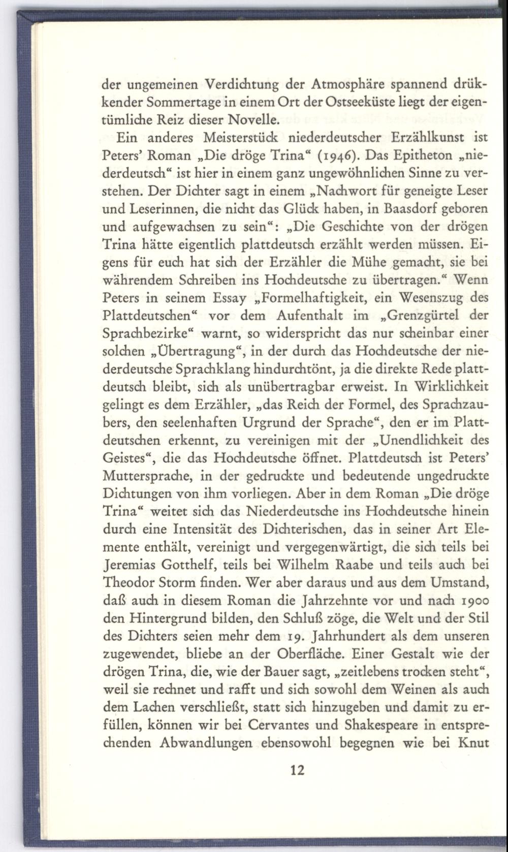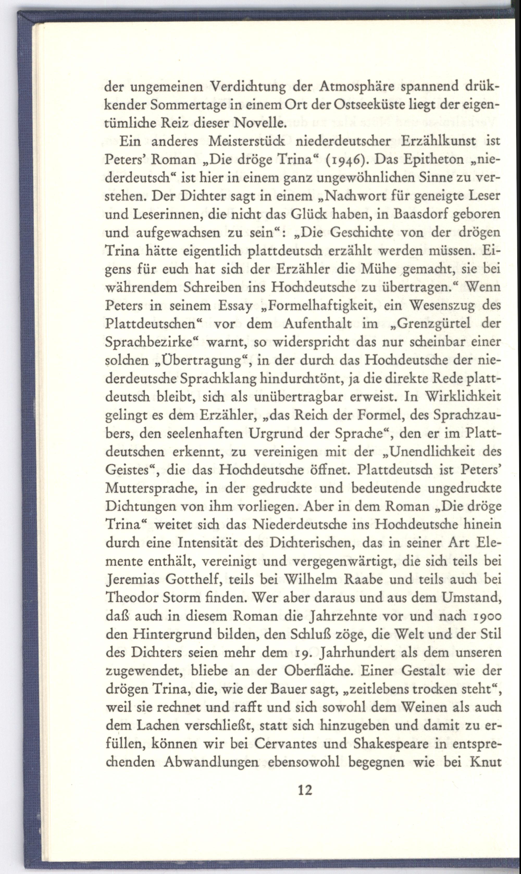 Ein anderes Meisterstück niederdeutscher Erzählkunst ist Peters’ Roman„Die dröge Trina“(1946). Das Epitheton„niederdeutsch“ ist hier in einem ganz ungewöhnlichen Sinne zu verstehen. Der Dichter sagt in einem„Nachwort für geneigte Leser und Leserinnen, die nicht das Glück haben, in Baasdorf geboren und aufgewachsen zu sein“:„Die Geschichte von der drögen Trina hätte eigentlich plattdeutsch erzählt werden müssen. Eigens für euch hat sich der Erzähler die Mühe gemacht, sie bei währendem Schreiben ins Hochdeutsche zu übertragen.“ Wenn Peters in seinem Essay„Formelhaftigkeit, ein Wesenszug des Plattdeutschen“ vor dem Aufenthalt im„Grenzgürtel der Sprachbezirke“ warnt, so widerspricht das nur scheinbar einer solchen„Übertragung“, in der durch das Hochdeutsche der niederdeutsche Sprachklang hindurchtönt, ja die direkte Rede plattdeutsch bleibt, sich als unübertragbar erweist. In Wirklichkeit gelingt es dem Erzähler,„das Reich der Formel, des Sprachzaubers, den seelenhaften Urgrund der Sprache“, den er im Plattdeutschen erkennt, zu vereinigen mit der„Unendlichkeit des Geistes“, die das Hochdeutsche öffnet. Plattdeutsch ist Peters’ Muttersprache, in der gedruckte und bedeutende ungedruckte Dichtungen von ihm vorliegen. Aber in dem Roman„Die dröge Trina“ weitet sich das Niederdeutsche ins Hochdeutsche hinein durch eine Intensität des Dichterischen, das in seiner Art Elemente enthält, vereinigt und vergegenwärtigt, die sich teils bei Jeremias Gotthelf, teils bei Wilhelm Raabe und teils auch bei Theodor Storm finden. Wer aber daraus und aus dem Umstand, daß auch in diesem Roman die Jahrzehnte vor und nach 1900 den Hintergrund bilden, den Schluß zöge, die Welt und der Stil des Dichters seien mehr dem ı9. Jahrhundert als dem unseren zugewendet, bliebe an der Oberfläche. Einer Gestalt wie der drögen Trina, die, wie der Bauer sagt,„zeitlebens trocken steht“, weil sie rechnet und rafft und sich sowohl dem Weinen als auch dem Lachen verschließt, statt sich hinzugeben und damit zu erfüllen, können wir bei Cervantes und Shakespeare in entsprechenden Abwandlungen ebensowohl begegnen wie bei Knut