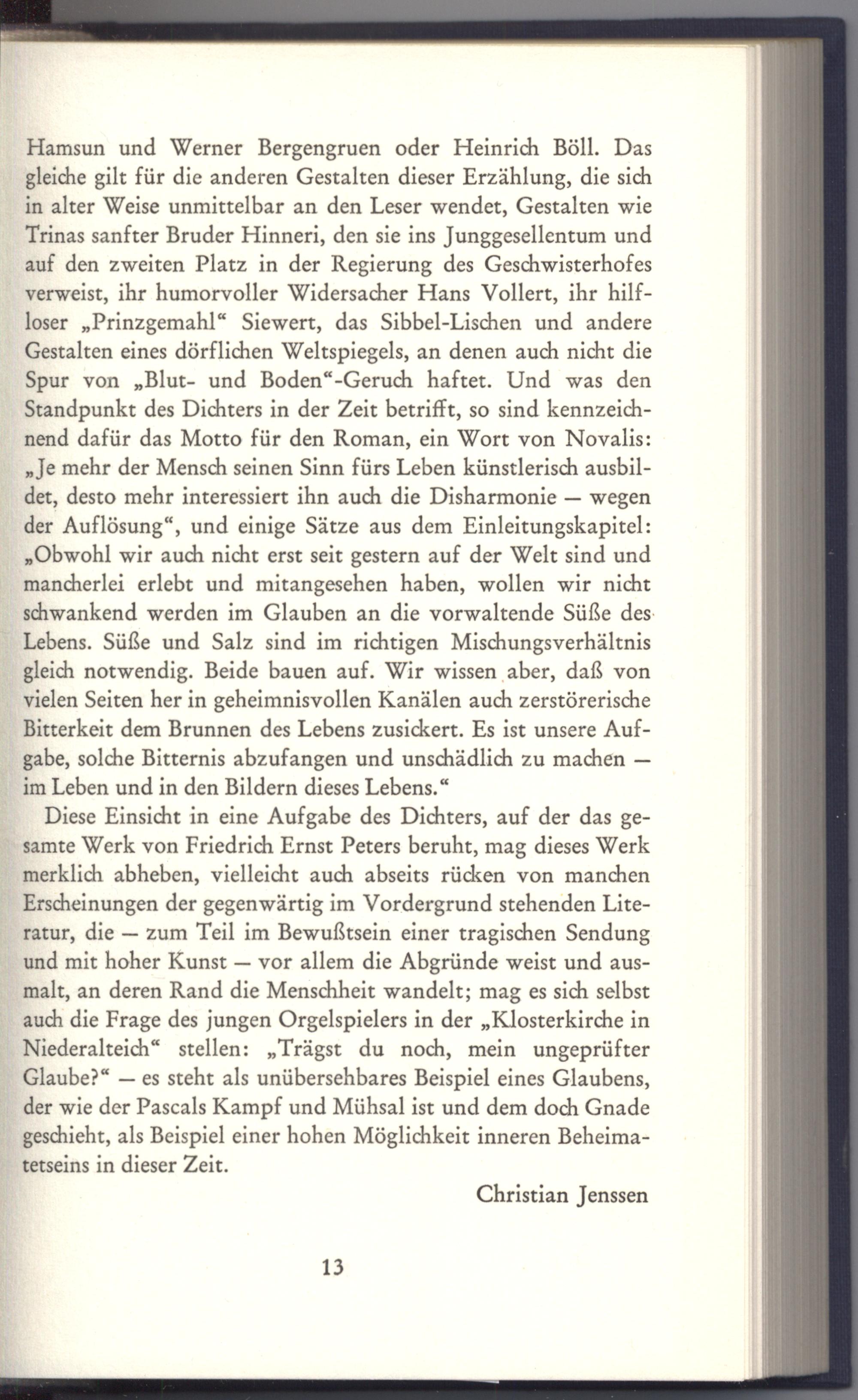 Hamsun und Werner Bergengruen oder Heinrich Böll. Das gleiche gilt für die anderen Gestalten dieser Erzählung, die sich in alter Weise unmittelbar an den Leser wendet, Gestalten wie Trinas sanfter Bruder Hinneri, den sie ins Junggesellentum und auf den zweiten Platz in der Regierung des Geschwisterhofes verweist, ihr humorvoller Widersacher Hans Vollert, ihr hilfloser„Prinzgemahl“ Siewert, das Sibbel-Lischen und andere Gestalten eines dörflichen Weltspiegels, an denen auch nicht die Spur von„Blut- und Boden“-Geruch haftet. Und was den Standpunkt des Dichters in der Zeit betrifft, so sind kennzeichnend dafür das Motto für den Roman, ein Wort von Novalis: „Je mehr der Mensch seinen Sinn fürs Leben künstlerisch ausbildet, desto mehr interessiert ihn auch die Disharmonie— wegen der Auflösung“, und einige Sätze aus dem Einleitungskapitel: „Obwohl wir auch nicht erst seit gestern auf der Welt sind und mancherlei erlebt und mitangesehen haben, wollen wir nicht schwankend werden im Glauben an die vorwaltende Süße des: Lebens. Süße und Salz sind im richtigen Mischungsverhältnis gleich notwendig. Beide bauen auf. Wir wissen aber, daß von vielen Seiten her in geheimnisvollen Kanälen auch zerstörerische Bitterkeit dem Brunnen des Lebens zusickert. Es ist unsere Aufgabe, solche Bitternis abzufangen und unschädlich zu machen— __ im Leben und in den Bildern dieses Lebens.“ Diese Einsicht in eine Aufgabe des Dichters, auf der das gesamte Werk von Friedrich Ernst Peters beruht, mag dieses Werk = merklich abheben, vielleicht auch abseits rücken von manchen Erscheinungen der gegenwärtig im Vordergrund stehenden Literatur, die— zum Teil im Bewußtsein einer tragischen Sendung und mit hoher Kunst— vor allem die Abgründe weist und ausmalt, an deren Rand die Menschheit wandelt; mag es sich selbst auch die Frage des jungen Orgelspielers in der„Klosterkirche in Niederalteich“ stellen:„Trägst du noch, mein ungeprüfter Glaube?“— es steht als unübersehbares Beispiel eines Glaubens, der wie der Pascals Kampf und Mühsal ist und dem doch Gnade _ geschieht, als Beispiel einer hohen Möglichkeit inneren Beheima