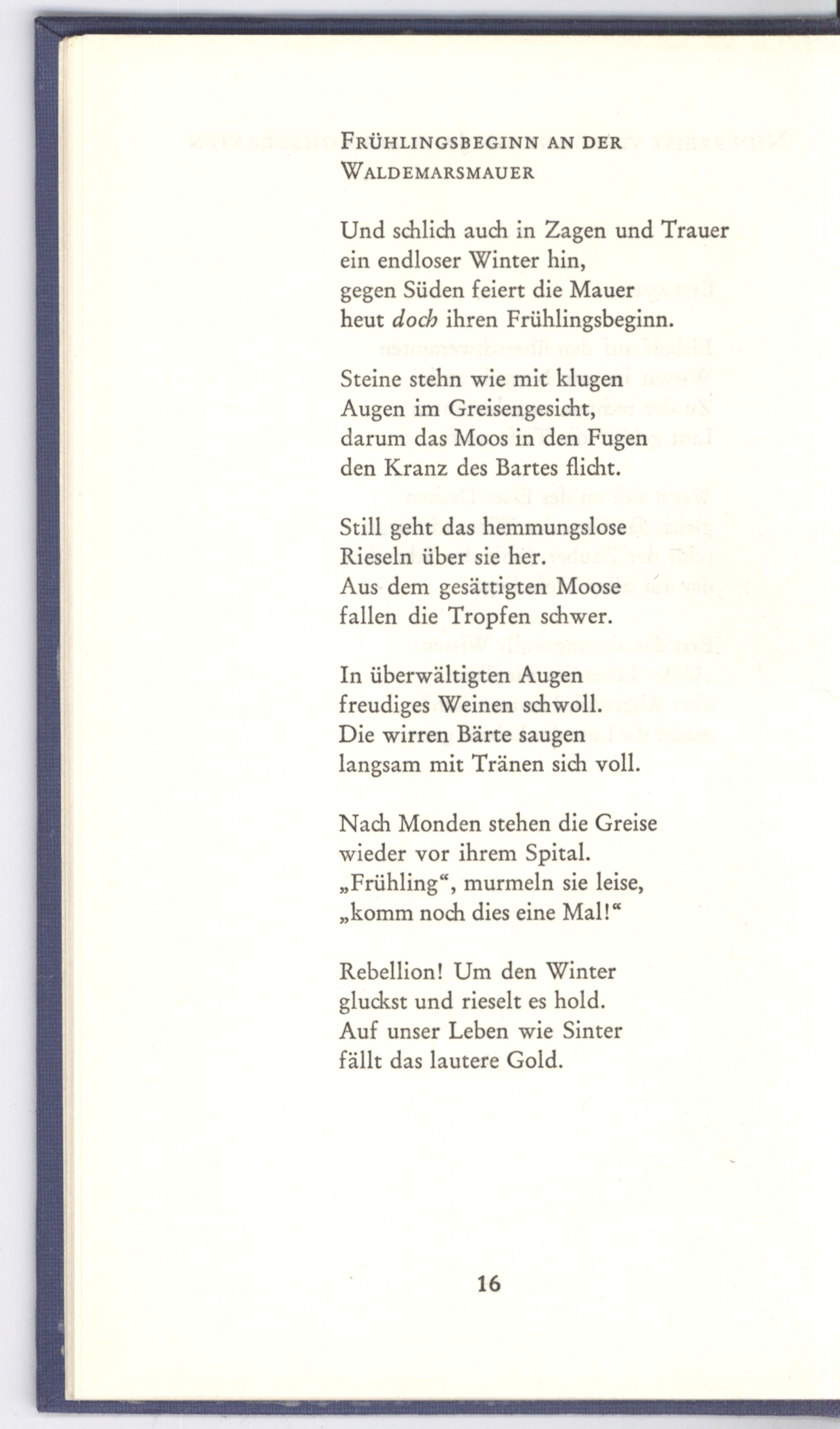 Steine stehn wie mit klugen Augen im Greisengesicht, darum das Moos in den Fugen den Kranz des Bartes flicht.