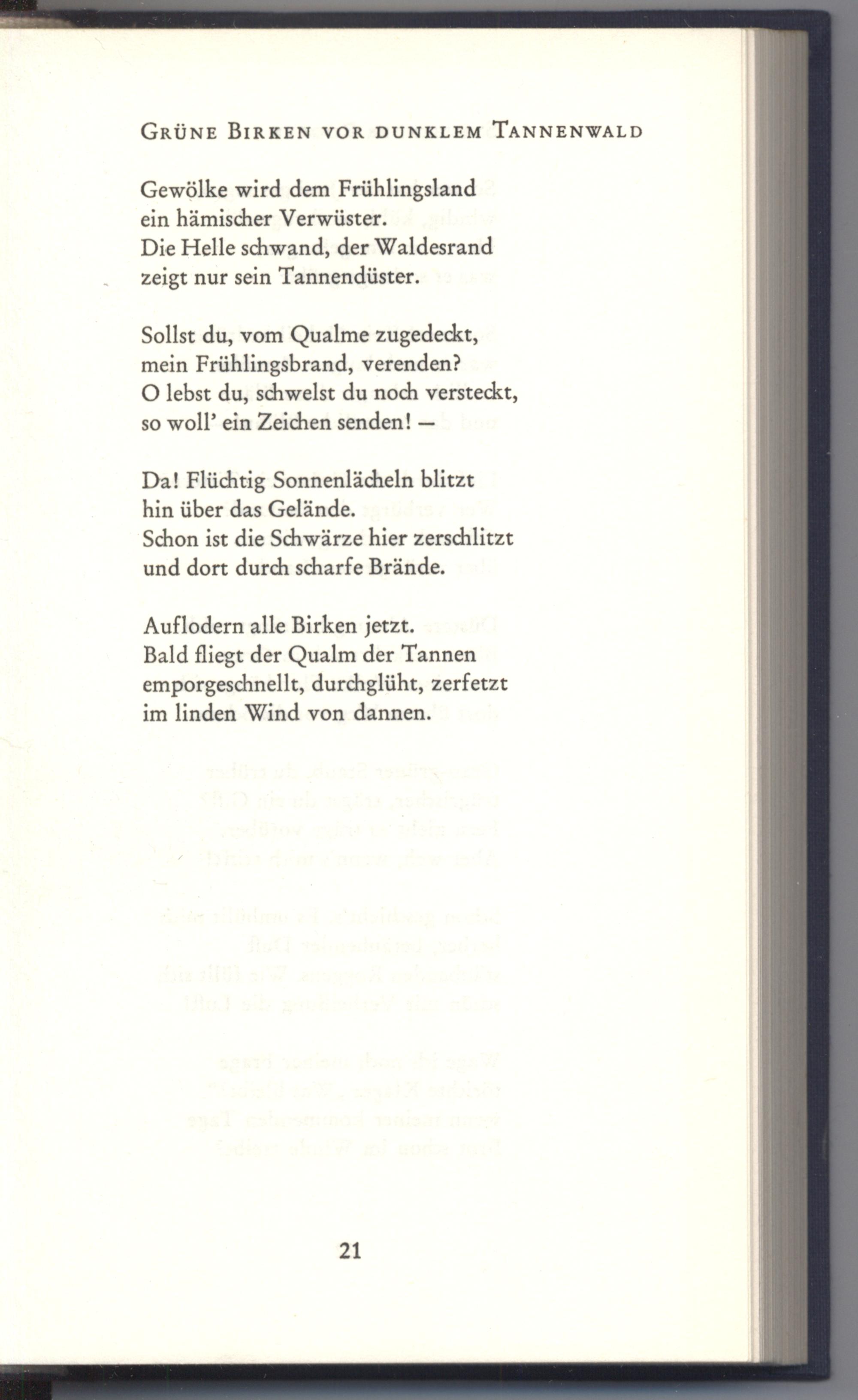 Bald fliegt der Qualm der Tannen emporgeschnellt, durchglüht, zerfetzt im linden Wind von dannen.