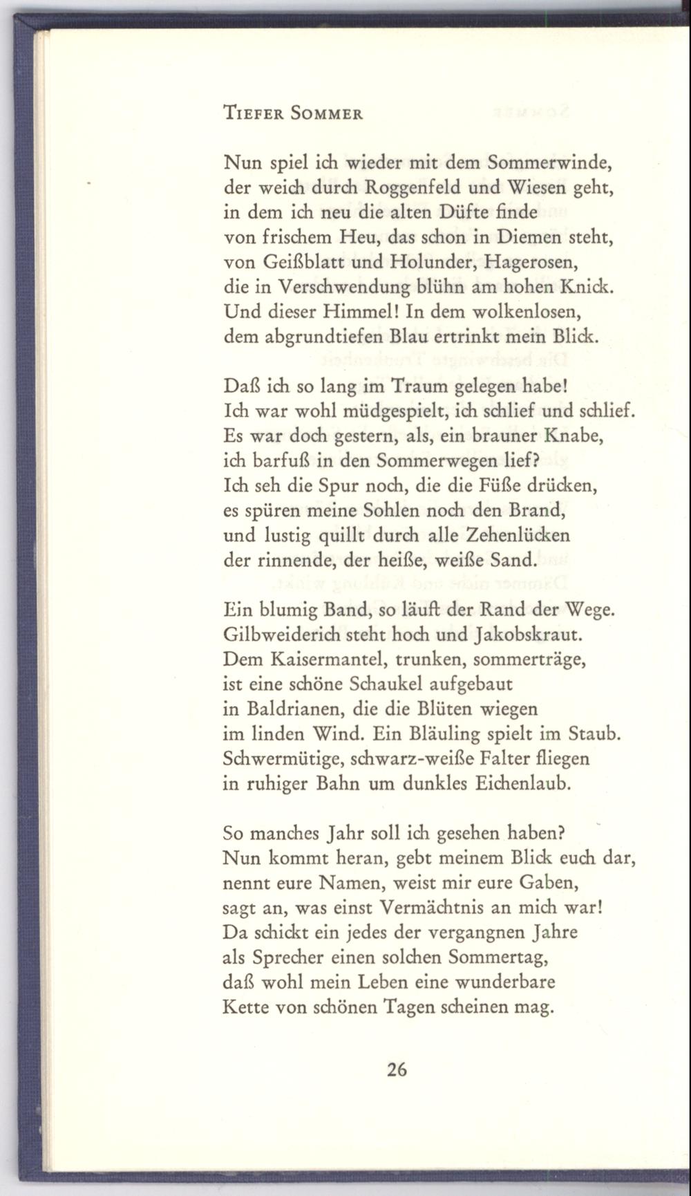 die in Verschwendung blühn am hohen Knick. Und dieser Himmel! In dem wolkenlosen, dem abgrundtiefen Blau ertrinkt mein Blick.
