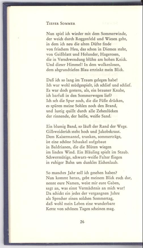 Nun spiel ich wieder mit dem Sommerwinde, der weich durch Roggenfeld und Wiesen geht, in dem ich neu die alten Düfte finde