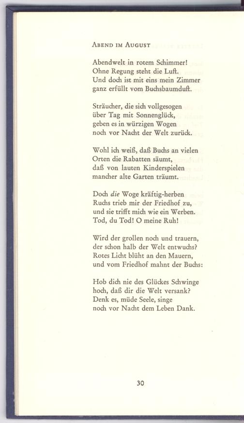 Wird der grollen noch und trauern, der schon halb der Welt entwuchs? Rotes Licht blüht an den Mauern, und vom Friedhof mahnt der Buchs: