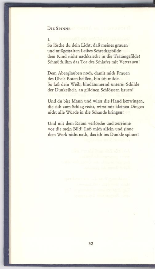 Und mit dem Raum verlösche und zerrinne vor dir mein Bild! Laß mich allein und sinne dem Werk nicht nach, das ich ins Dunkle spinne!