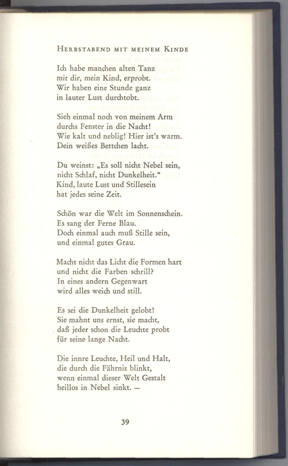 Sie mahnt uns ernst, sie macht, daß jeder schon die Leuchte probt für seine lange Nacht.