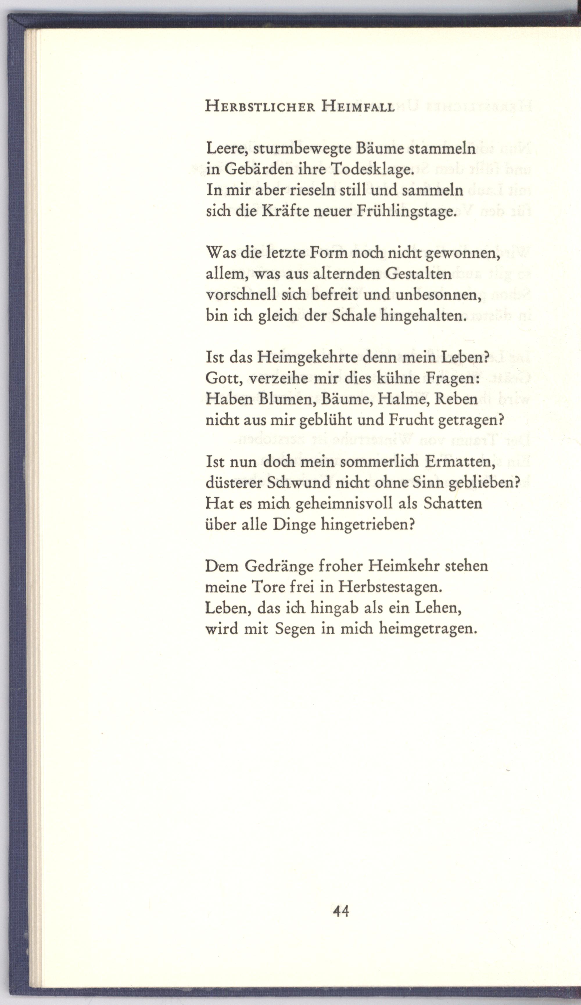 Dem Gedränge froher Heimkehr stehen meine Tore frei in Herbstestagen. Leben, das ich hingab als ein Lehen, wird mit Segen in mich heimgetragen.