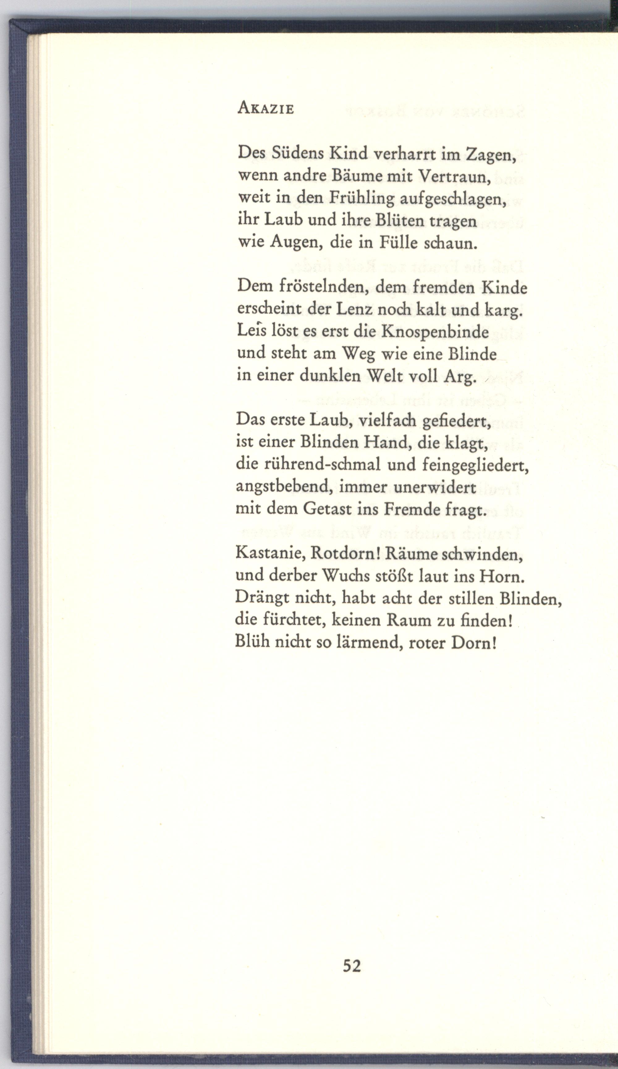 Des Südens Kind verharrt im Zagen, wenn andre Bäume mit Vertraun, weit in den Frühling aufgeschlagen, ihr Laub und ihre Blüten tragen