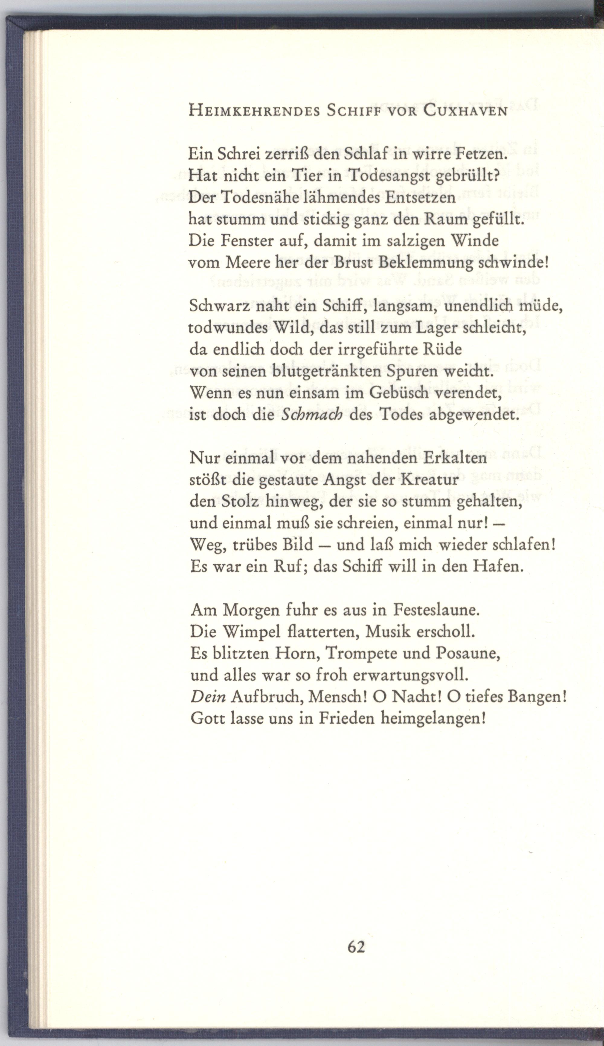 Weg, trübes Bild— und laß mich wieder schlafen! Es war ein Ruf; das Schiff will in den Hafen.