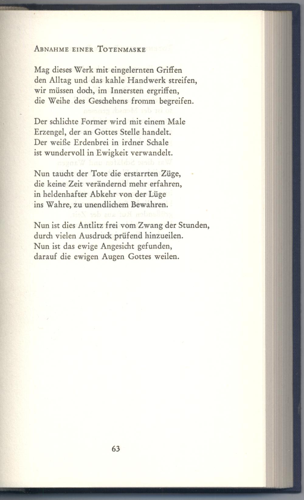 Nun taucht der Tote die erstarrten Züge, die keine Zeit verändernd mehr erfahren, in heldenhafter Abkehr von der Lüge ins Wahre, zu unendlichem Bewahren.