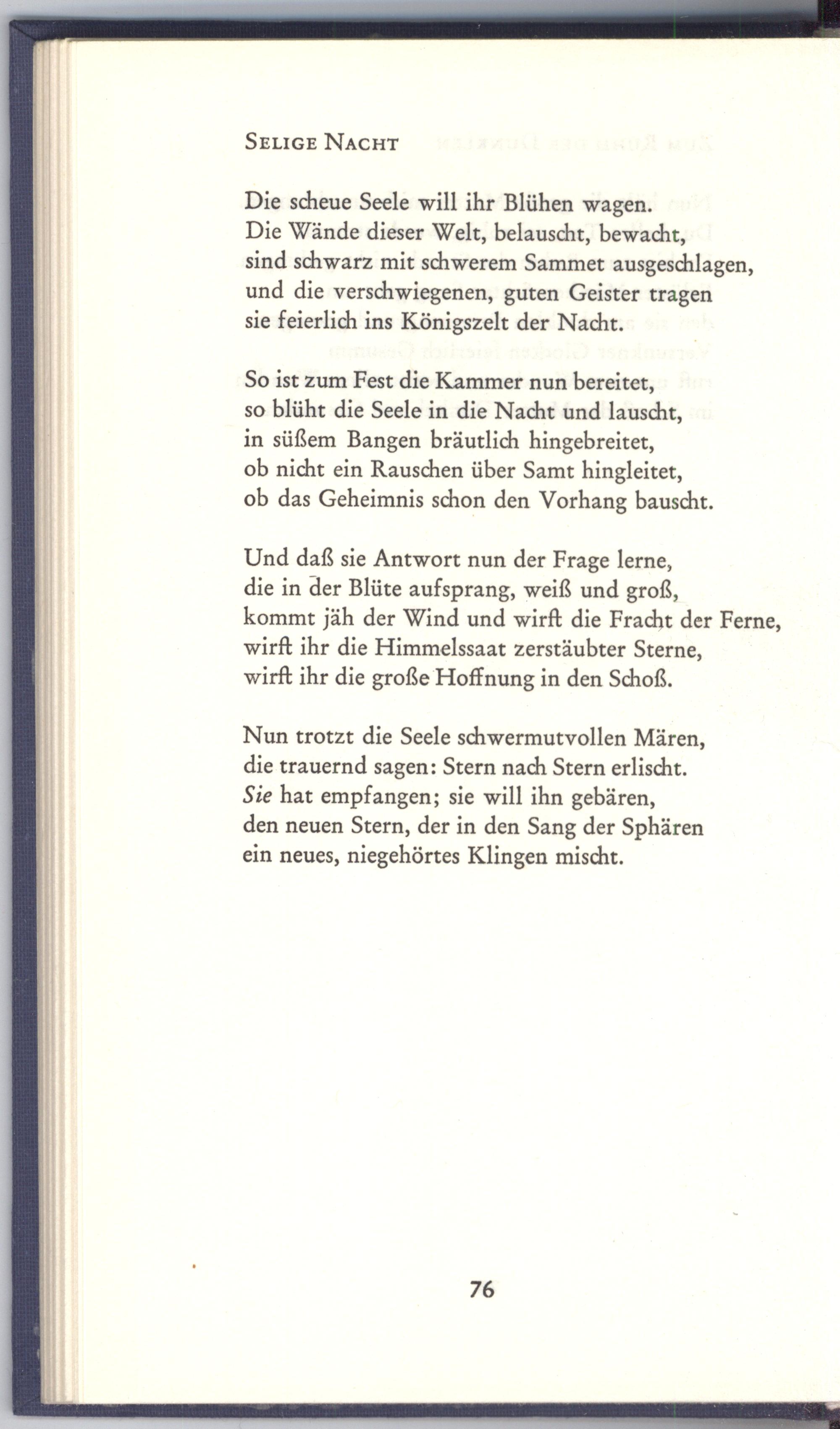 Nun trotzt die Seele schwermutvollen Mären, die trauernd sagen: Stern nach Stern erlischt. Sie hat empfangen; sie will ihn gebären,