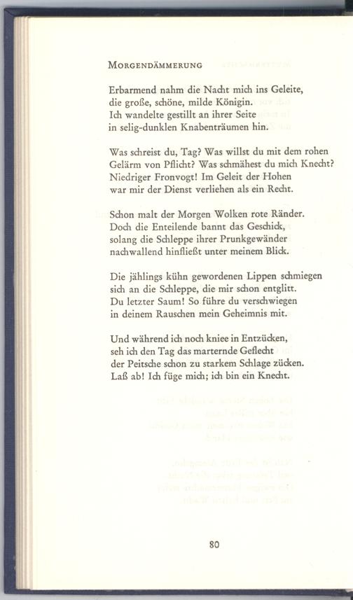 Schon malt der Morgen Wolken rote Ränder. Doch die Enteilende bannt das Geschick, solang die Schleppe ihrer Prunkgewänder nachwallend hinfließt unter meinem Blick.