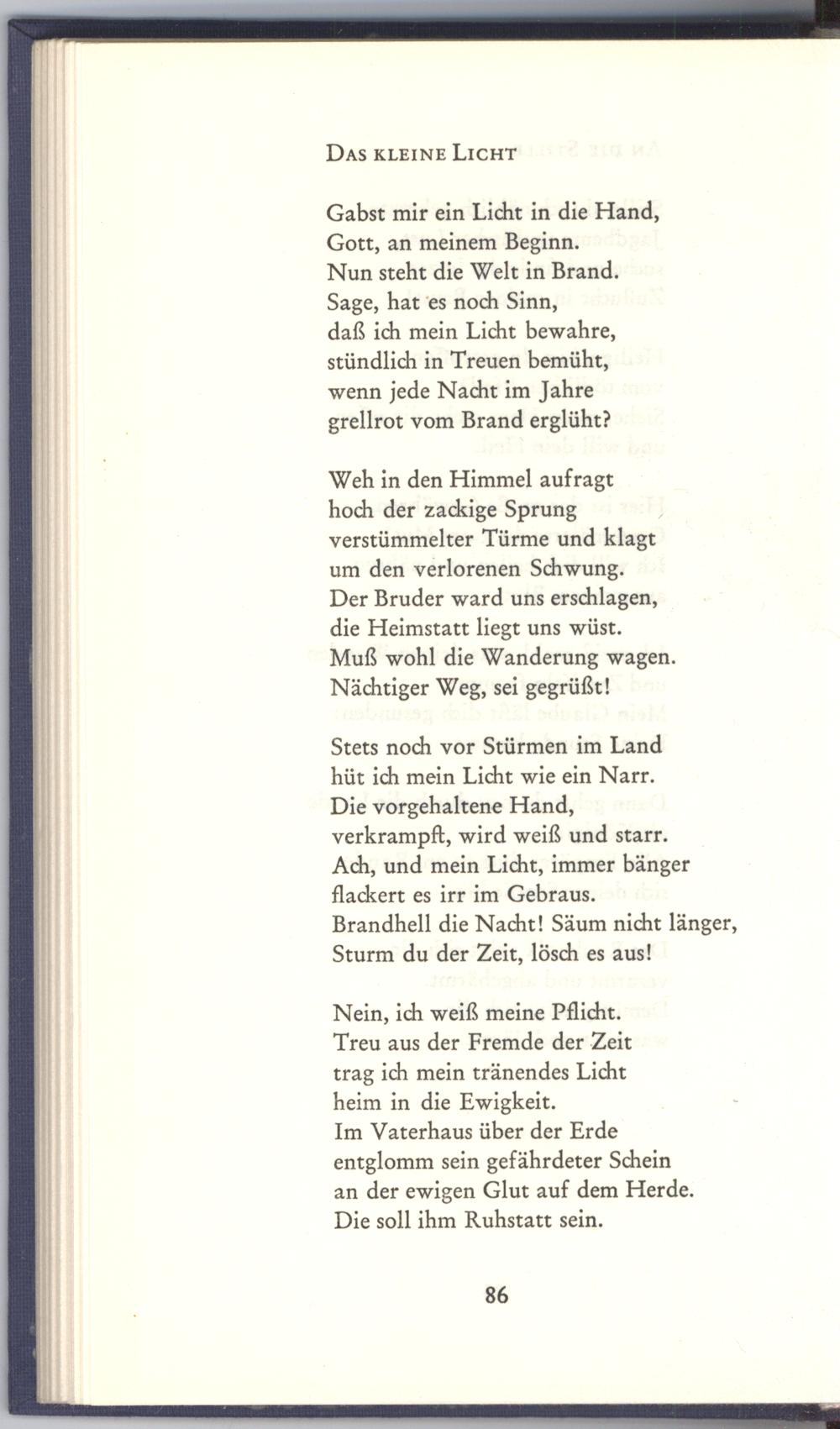 daß ich mein Licht bewahre, stündlich in Treuen bemüht, wenn jede Nacht im Jahre grellrot vom Brand erglüht?