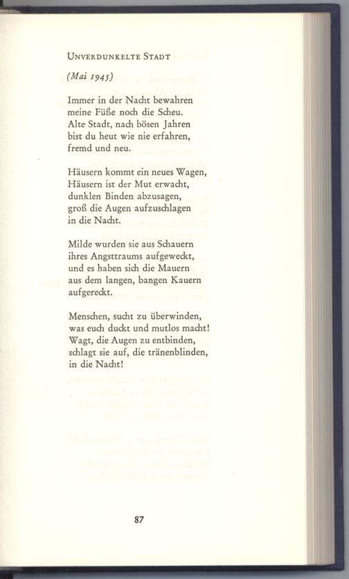 Immer in der Nacht bewahren meine Füße noch die Scheu. Alte Stadt, nach bösen Jahren bist du heut wie nie erfahren, fremd und neu.