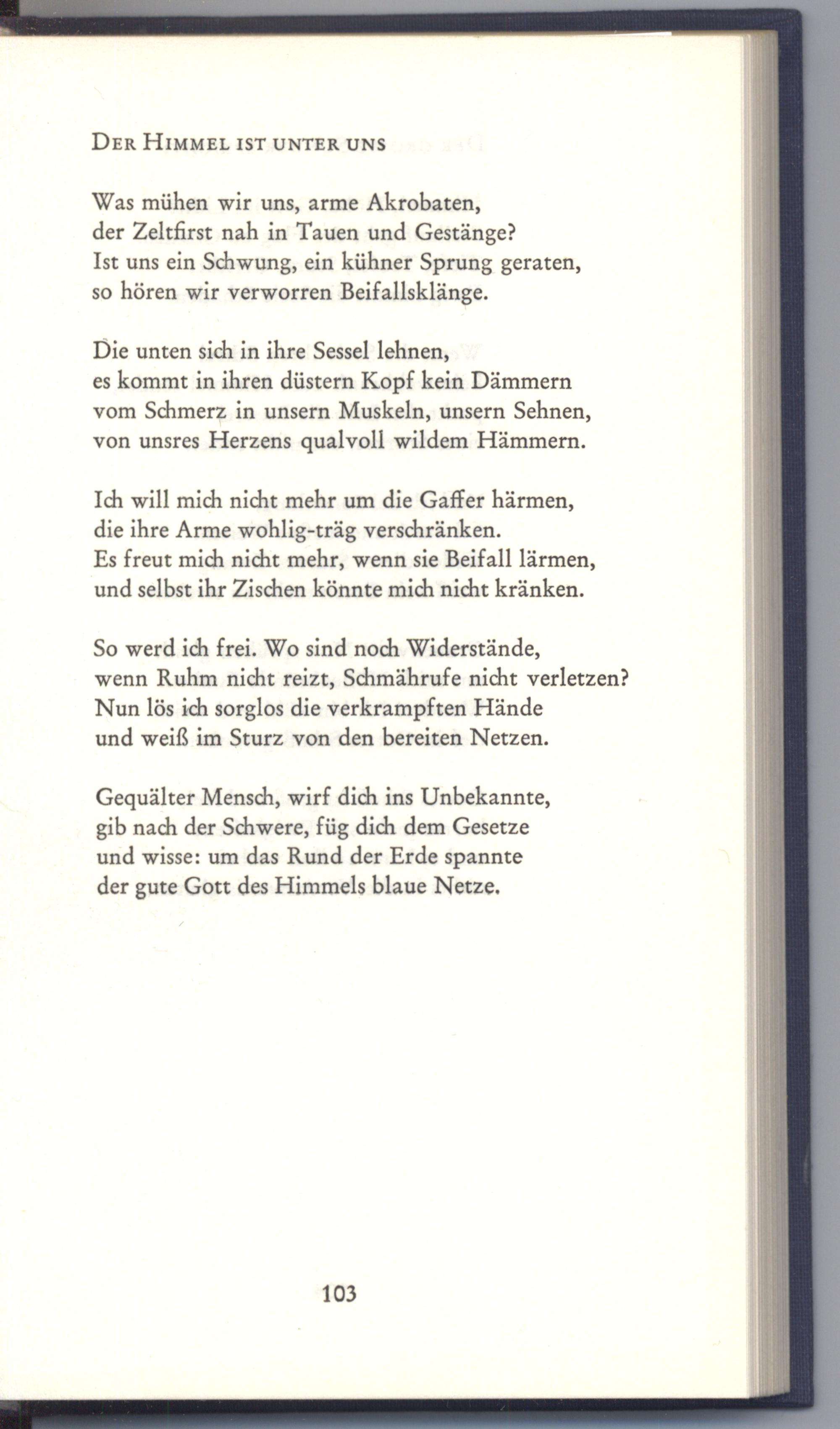 So werd ich frei. Wo sind noch Widerstände, wenn Ruhm nicht reizt, Schmährufe nicht verletzen? Nun lös ich sorglos die verkrampften Hände und weiß im Sturz von den bereiten Netzen.