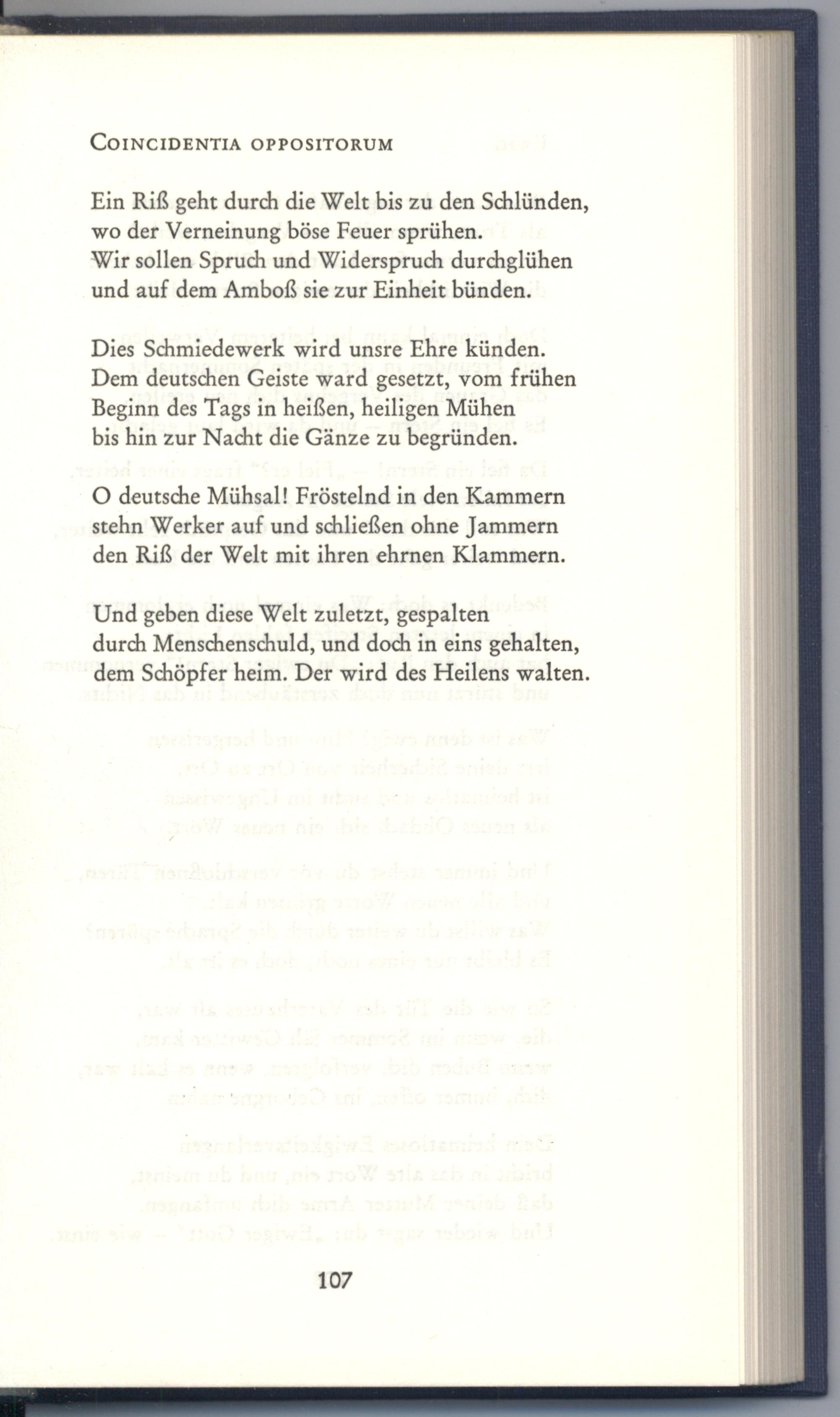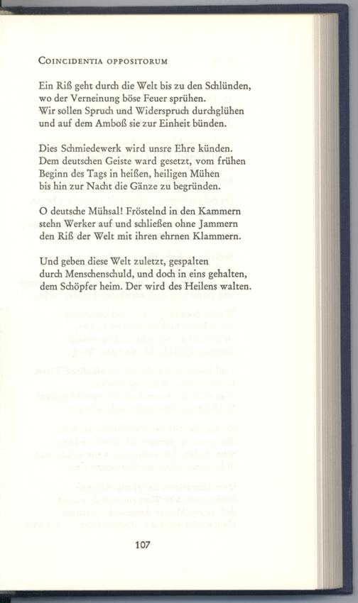 O deutsche Mühsal! Fröstelnd in den Kammern stehn Werker auf und schließen ohne Jammern den Riß der Welt mit ihren ehrnen Klammern.