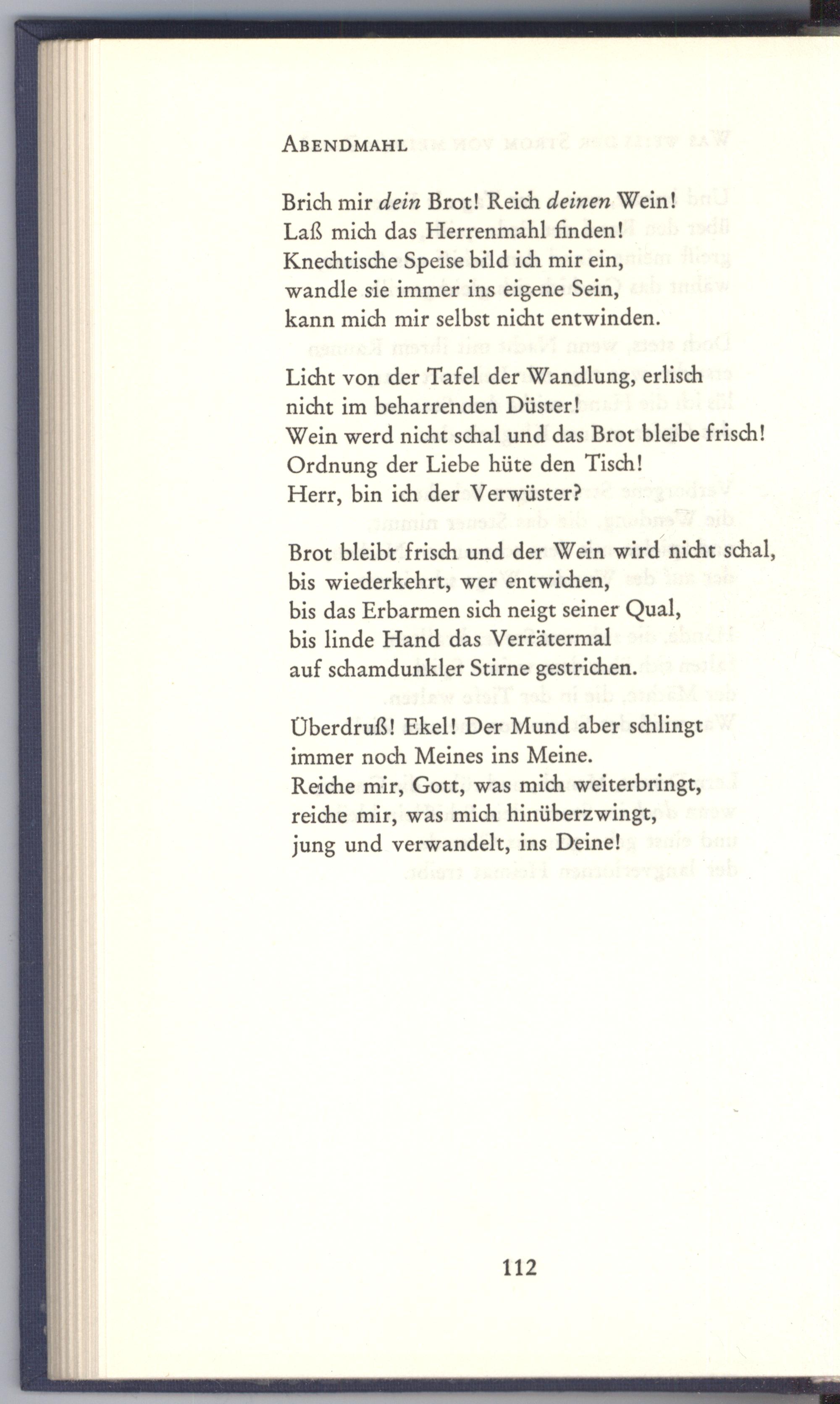 Brich mir dein Brot! Reich deinen Wein! Laß mich das Herrenmahl finden! Knechtische Speise bild ich mir ein, wandle sie immer ins eigene Sein, kann mich mir selbst nicht entwinden.
