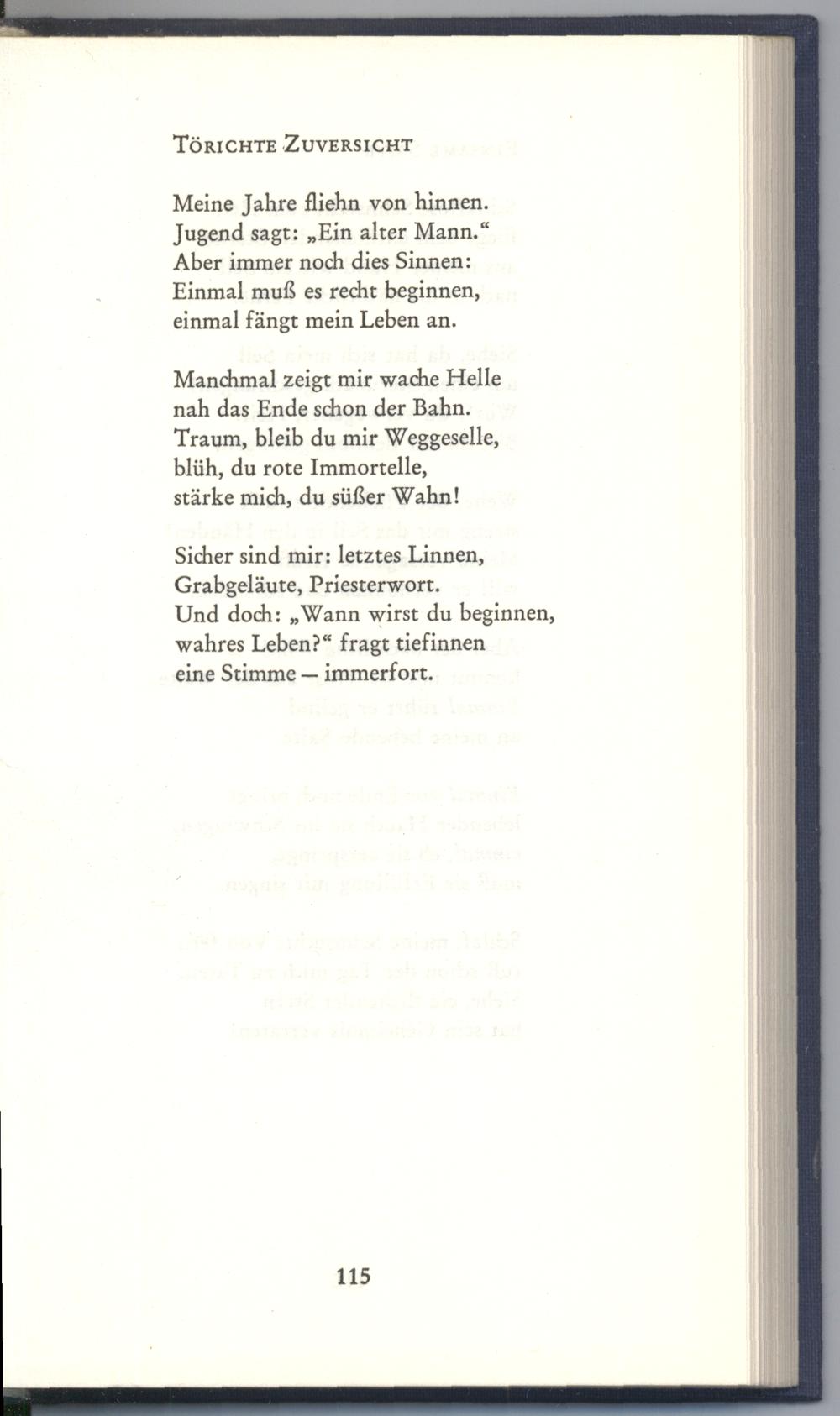 Meine Jahre fliehn von hinnen. Jugend sagt:„Ein alter Mann.“ Aber immer noch dies Sinnen: Einmal muß es recht beginnen, einmal fängt mein Leben an.