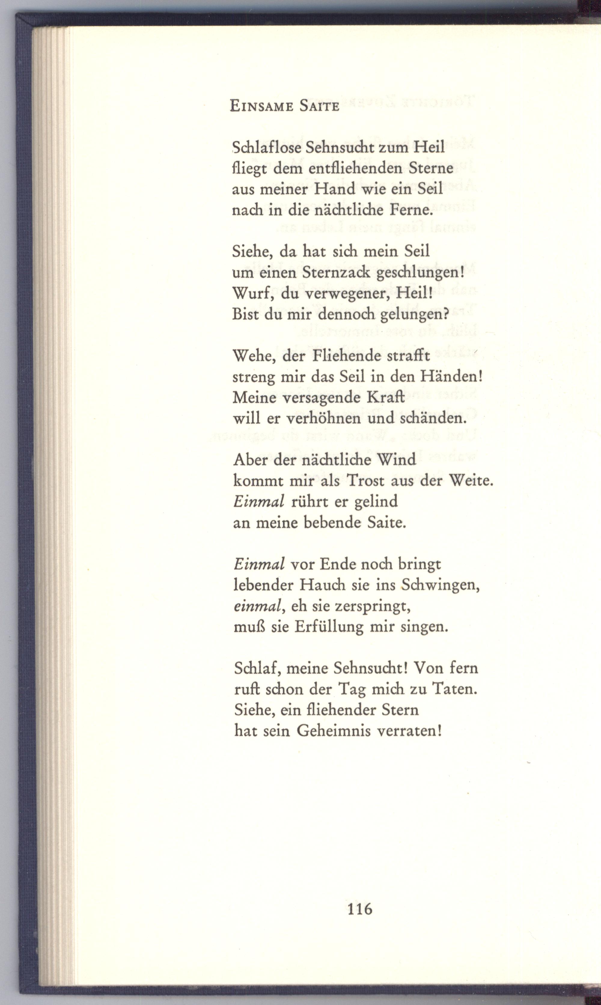 Schlaflose Sehnsucht zum Heil fliegt dem entfliehenden Sterne aus meiner Hand wie ein Seil nach in die nächtliche Ferne.