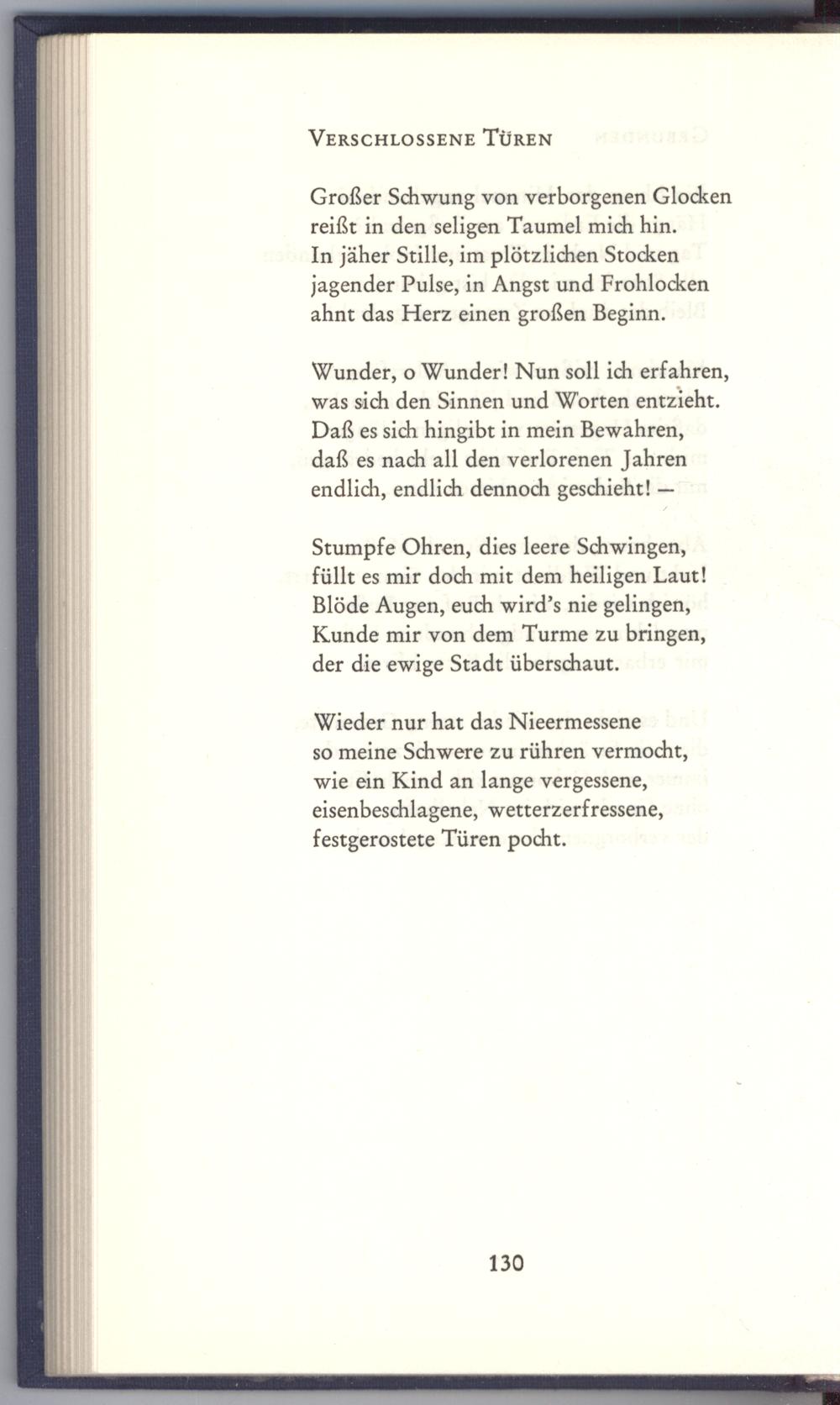 so meine Schwere zu rühren vermocht, wie ein Kind an lange vergessene, eisenbeschlagene, wetterzerfressene, festgerostete Türen pocht.