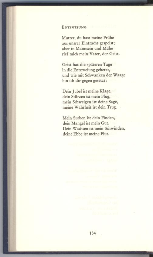 Mutter, du hast meine Frühe aus unsrer Eintracht gespeist; aber in Mannsein und Mühe rief mich mein Vater, der Geist.