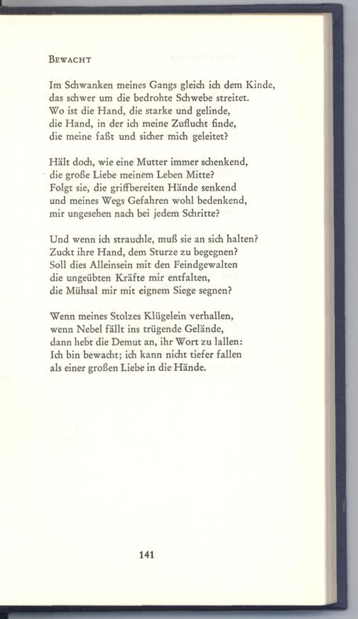 Wenn meines Stolzes Klügelein verhallen, wenn Nebel fällt ins trügende Gelände, dann hebt die Demut an, ihr Wort zu lallen: Ich bin bewacht; ich kann nicht tiefer fallen als einer großen Liebe in die Hände.