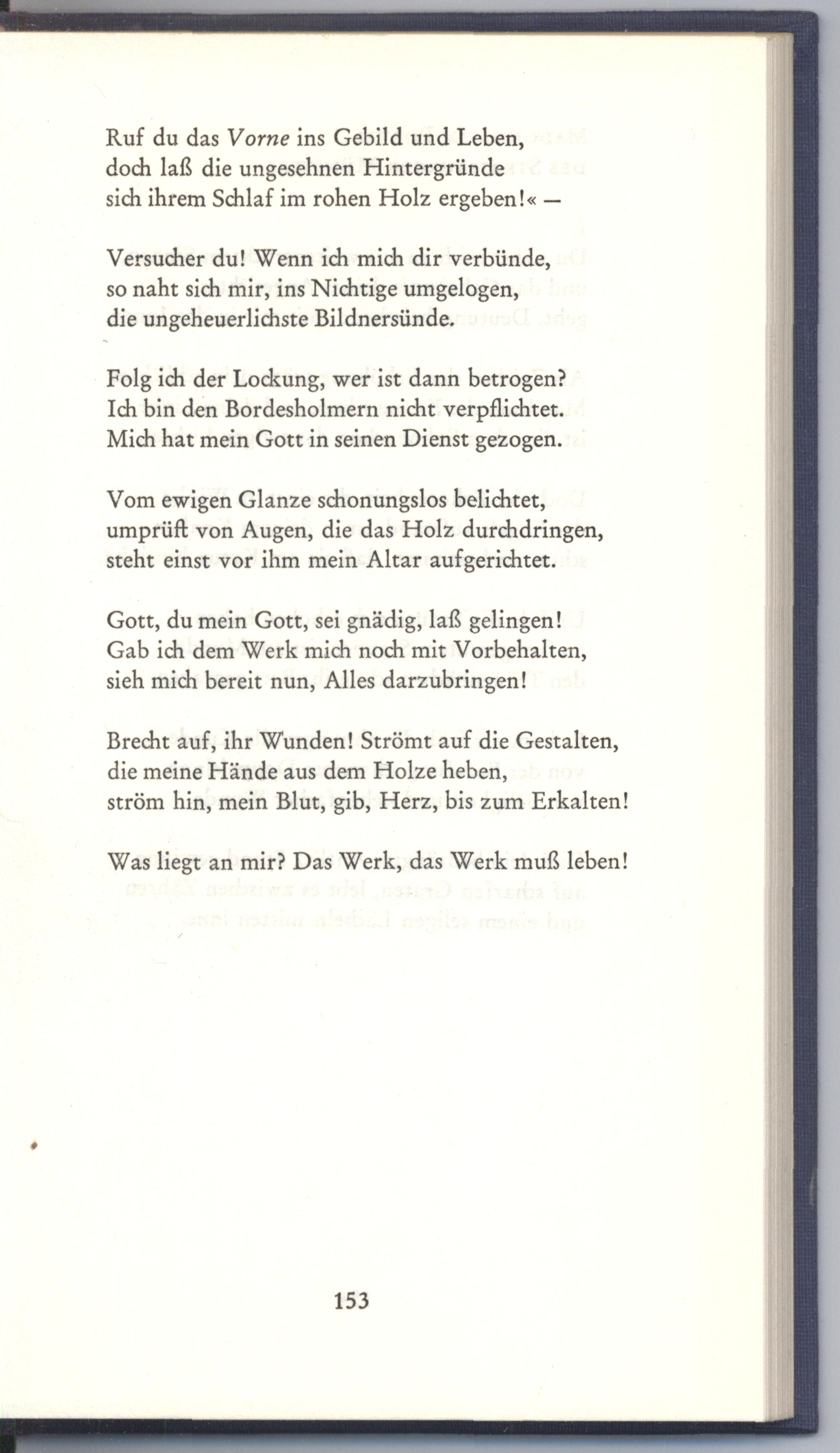 Vom ewigen Glanze schonungslos belichtet, umprüft von Augen, die das Holz durchdringen, steht einst vor ihm mein Altar aufgerichtet.