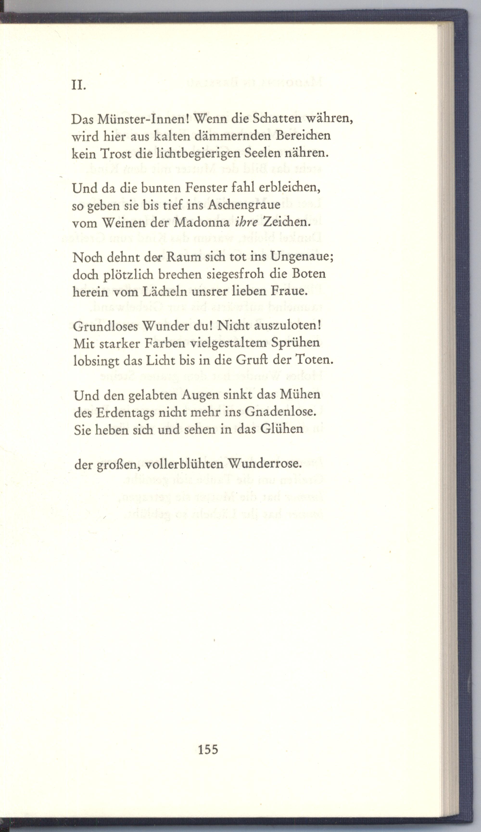 _ Und da die bunten Fenster fahl erbleichen, so geben sie bis tief ins Aschengraue vom Weinen der Madonna ihre Zeichen.