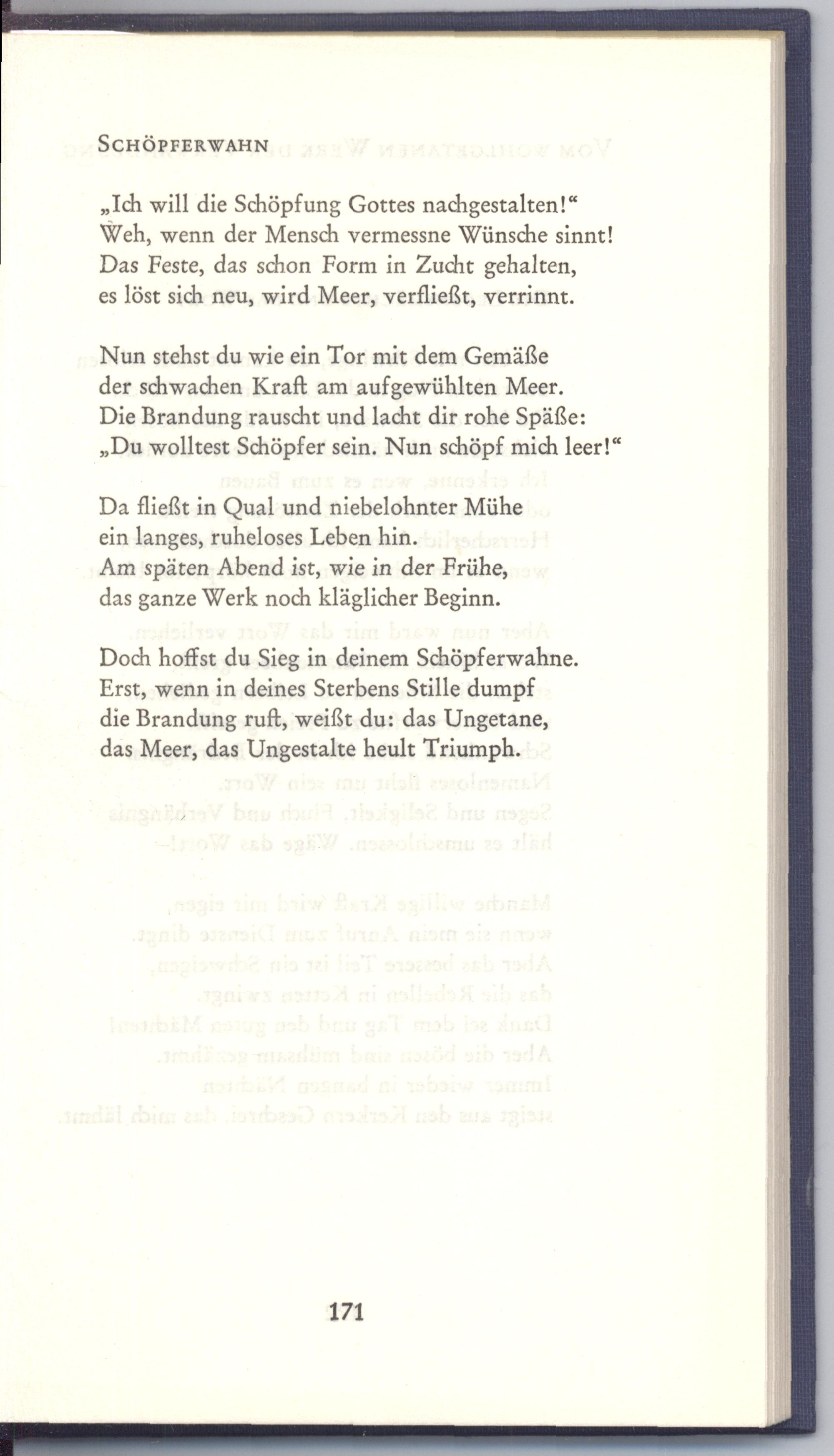 „Ich will die Schöpfung Gottes nachgestalten!“ Weh, wenn der Mensch vermessne Wünsche sinnt! Das Feste, das schon Form in Zucht gehalten, es löst sich neu, wird Meer, verfließt, verrinnt.
