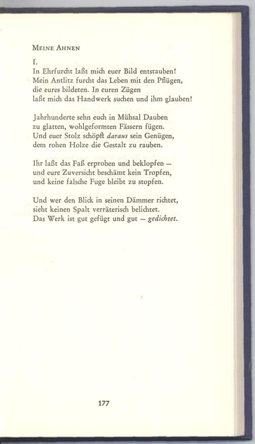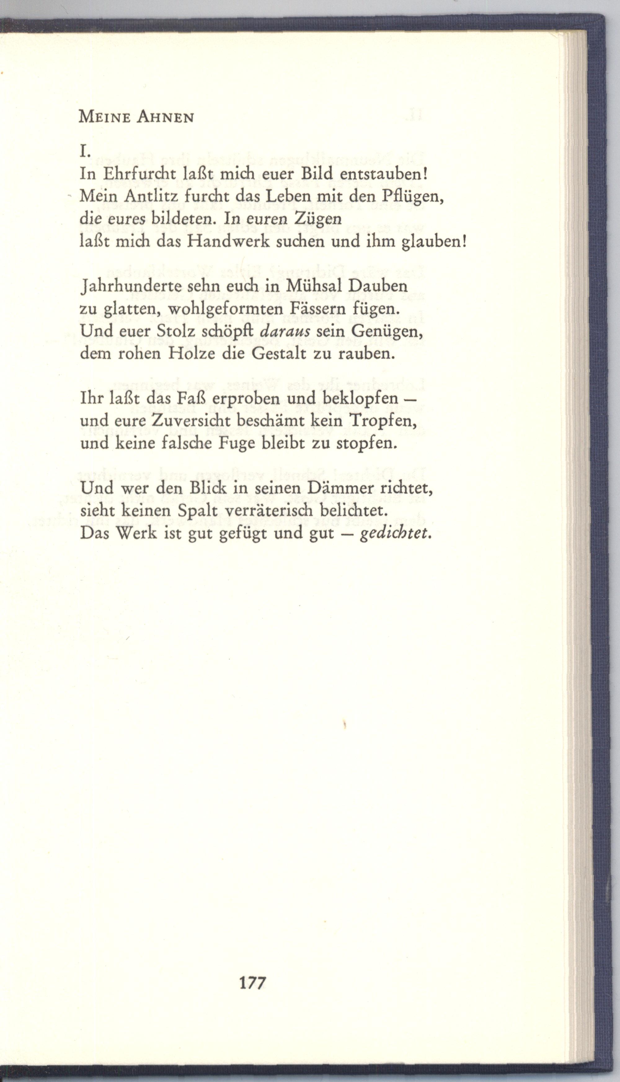 Jahrhunderte sehn euch in Mühsal Dauben zu glatten, wohlgeformten Fässern fügen. Und euer Stolz schöpft daraus sein Genügen, dem rohen Holze die Gestalt zu rauben.