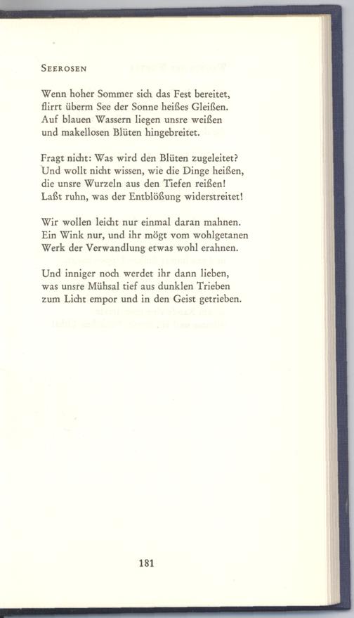 Wenn hoher Sommer sich das Fest bereitet, flirrt überm See der Sonne heißes Gleißen. Auf blauen Wassern liegen unsre weißen und makellosen Blüten hingebreitet.