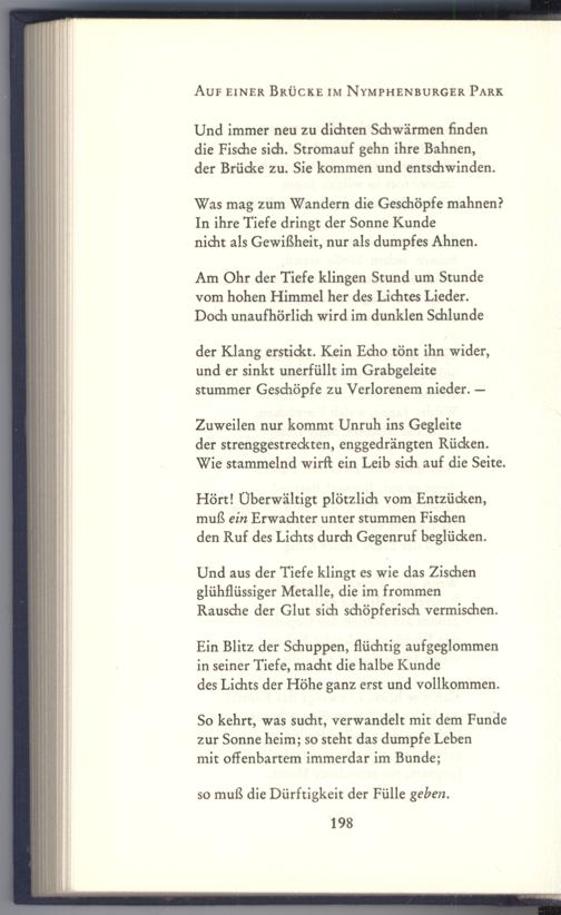 Und immer neu zu dichten Schwärmen finden die Fische sich. Stromauf gehn ihre Bahnen, der Brücke zu. Sie kommen und entschwinden.