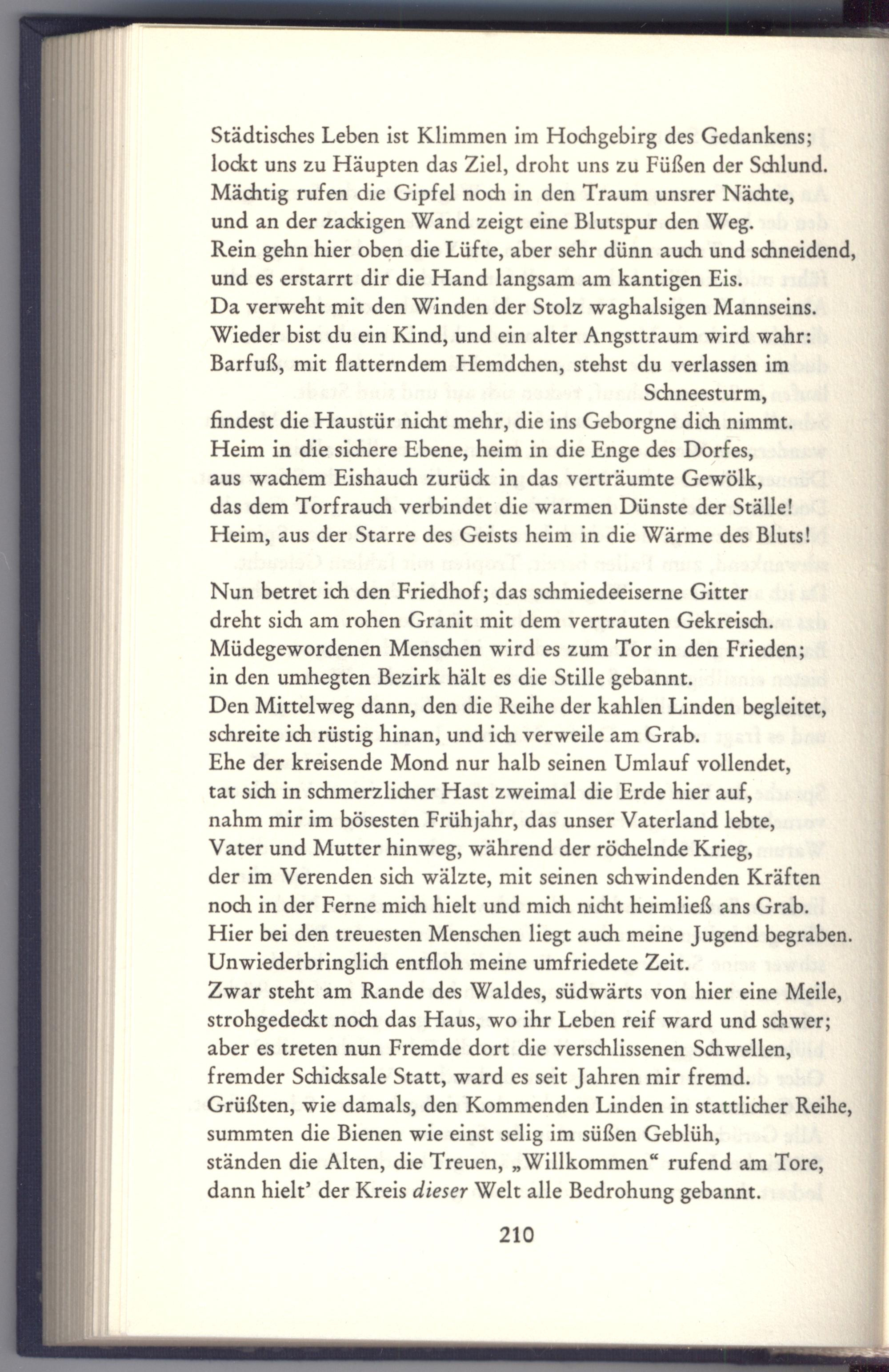 der im Verenden sich wälzte, mit seinen schwindenden Kräften noch in der Ferne mich hielt und mich nicht heimließ ans Grab. Hier bei den treuesten Menschen liegt auch meine Jugend begraben. Unwiederbringlich entfloh meine umfriedete Zeit.