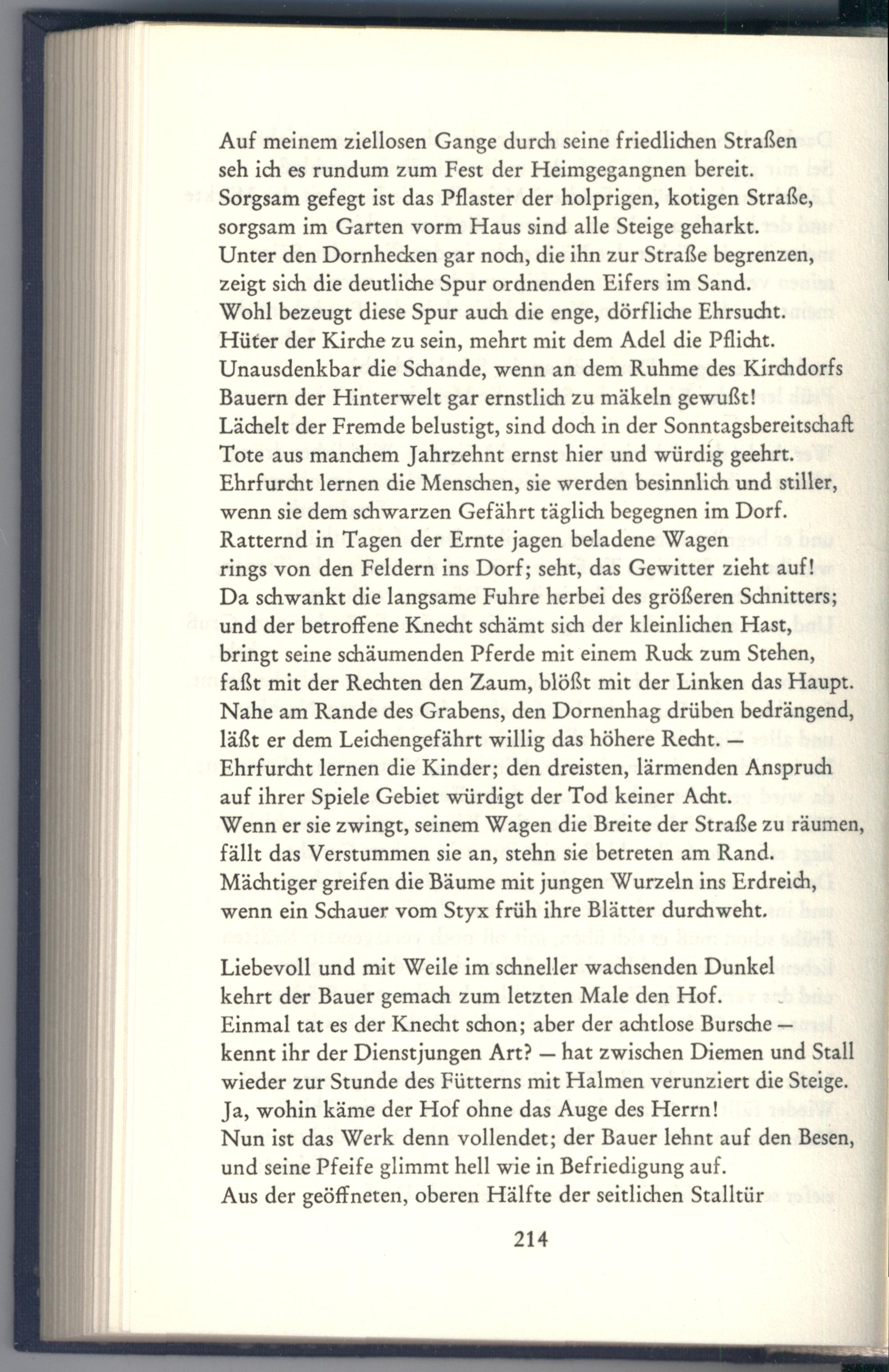Da schwankt die langsame Fuhre herbei des größeren Schnitters; und der betroffene Knecht schämt sich der kleinlichen Hast, bringt seine schäumenden Pferde mit einem Ruck zum Stehen, faßt mit der Rechten den Zaum, blößt mit der Linken das Haupt. Nahe am Rande des Grabens, den Dornenhag drüben bedrängend, Jäßt er dem Leichengefährt willig das höhere Recht.—