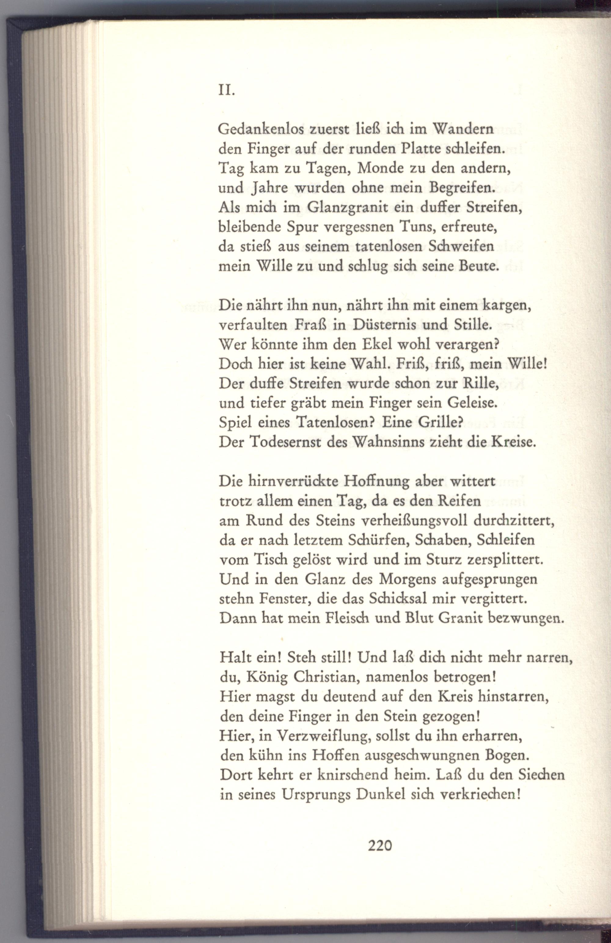 Gedankenlos zuerst ließ ich im Wandern den Finger auf der runden Platte schleifen. Tag kam zu Tagen, Monde zu den andern, und Jahre wurden ohne mein Begreifen. Als mich im Glanzgranit ein duffer Streifen, bleibende Spur vergessnen Tuns, erfreute,