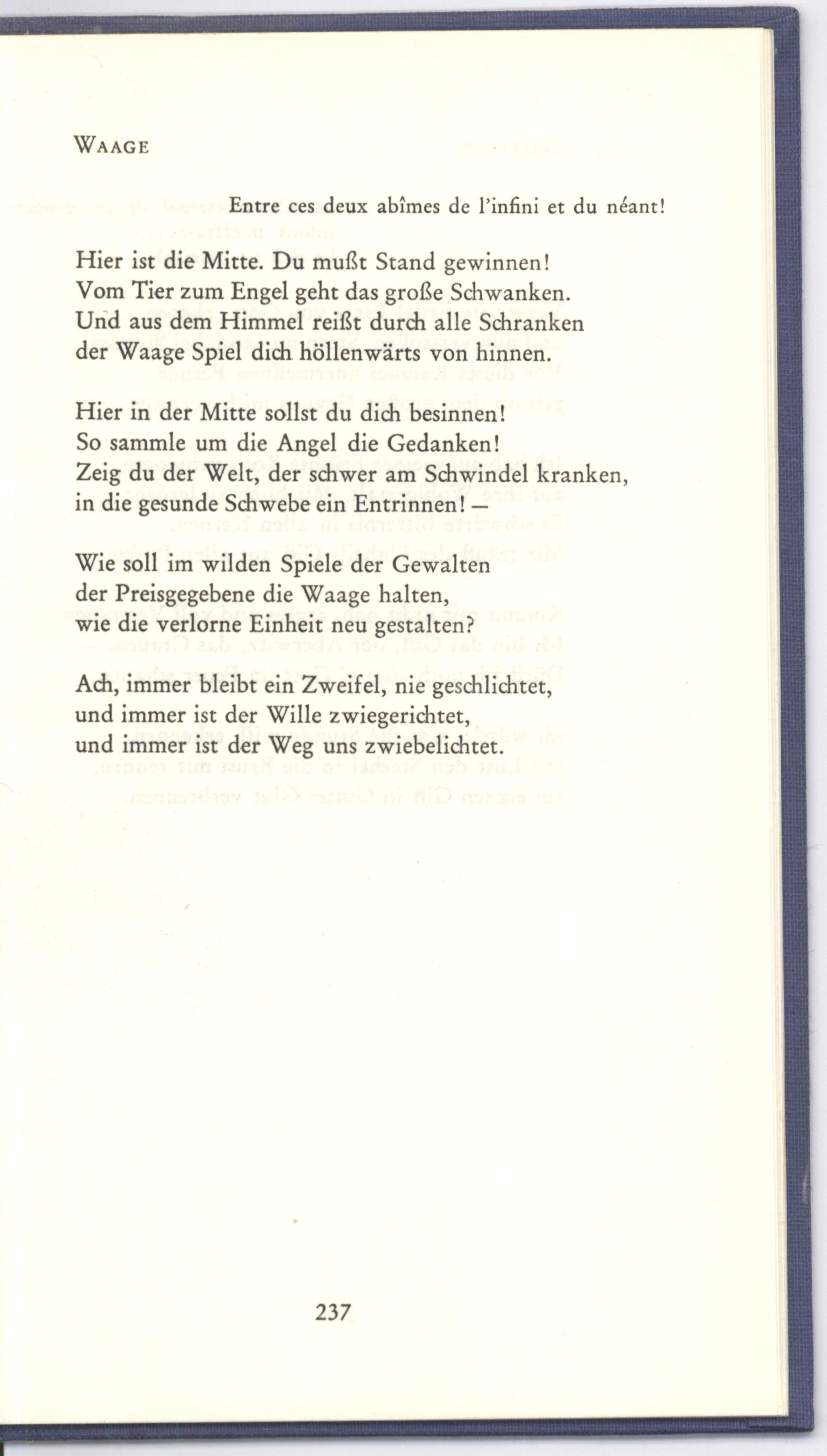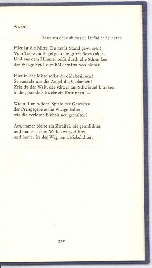 Hier ist die Mitte. Du mußt Stand gewinnen! Vom Tier zum Engel geht das große Schwanken. Und aus dem Himmel reißt durch alle Schranken der Waage Spiel dich höllenwärts von hinnen.