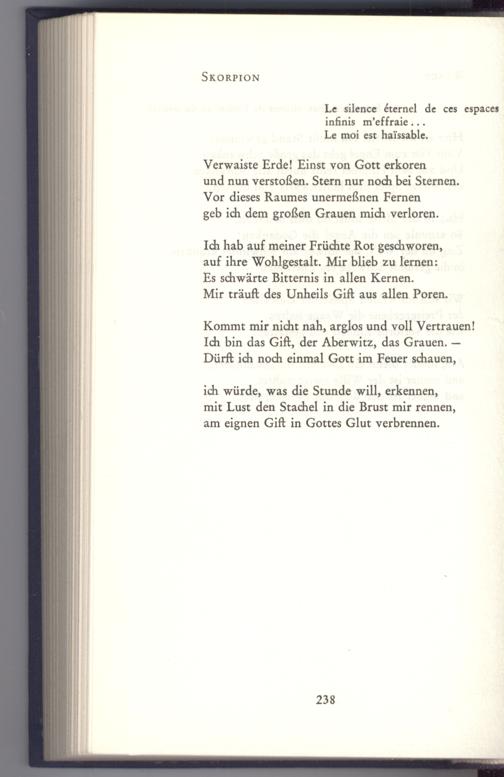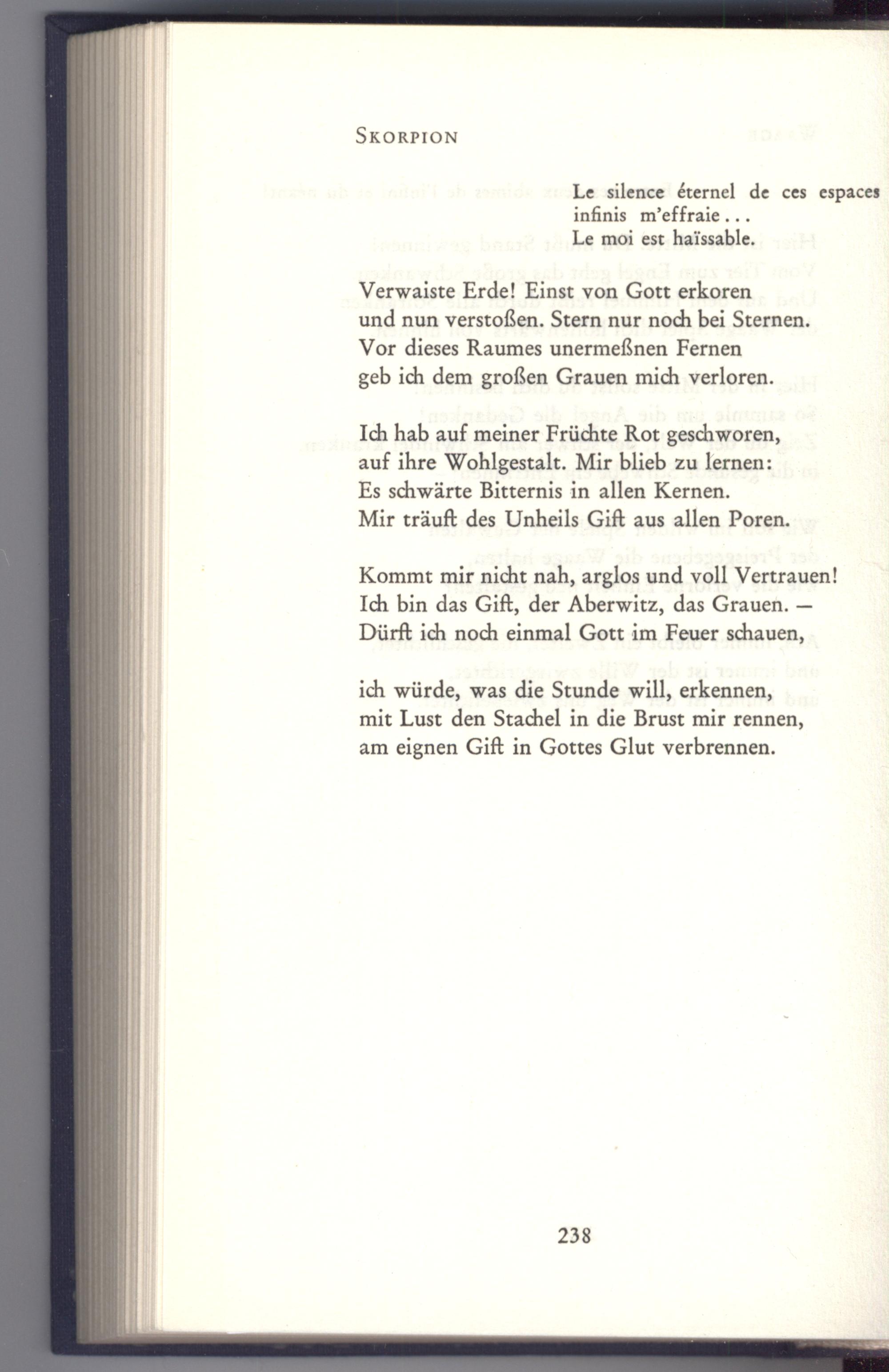 Kommt mir nicht nah, arglos und voll Vertrauen! Ich bin das Gift, der Aberwitz, das Grauen.— Dürft ich noch einmal Gott im Feuer schauen,