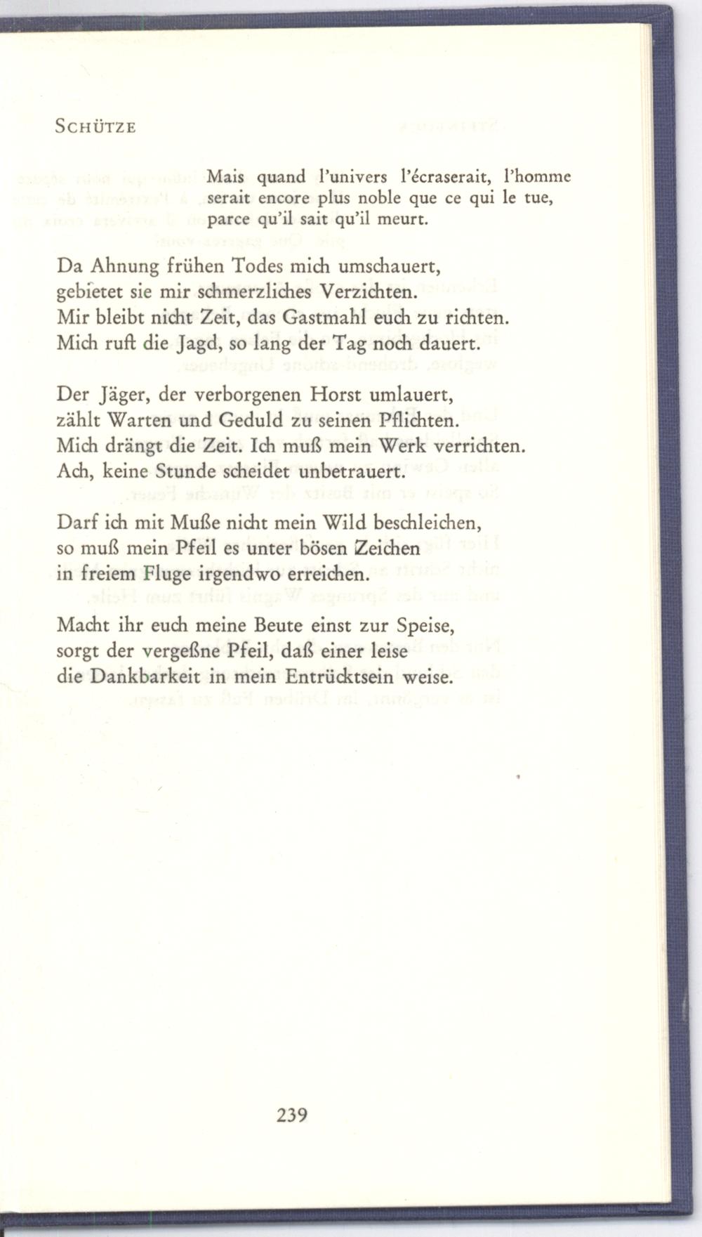Darf ich mit Muße nicht mein Wild beschleichen, so muß mein Pfeil es unter bösen Zeichen in freiem Fluge irgendwo erreichen.