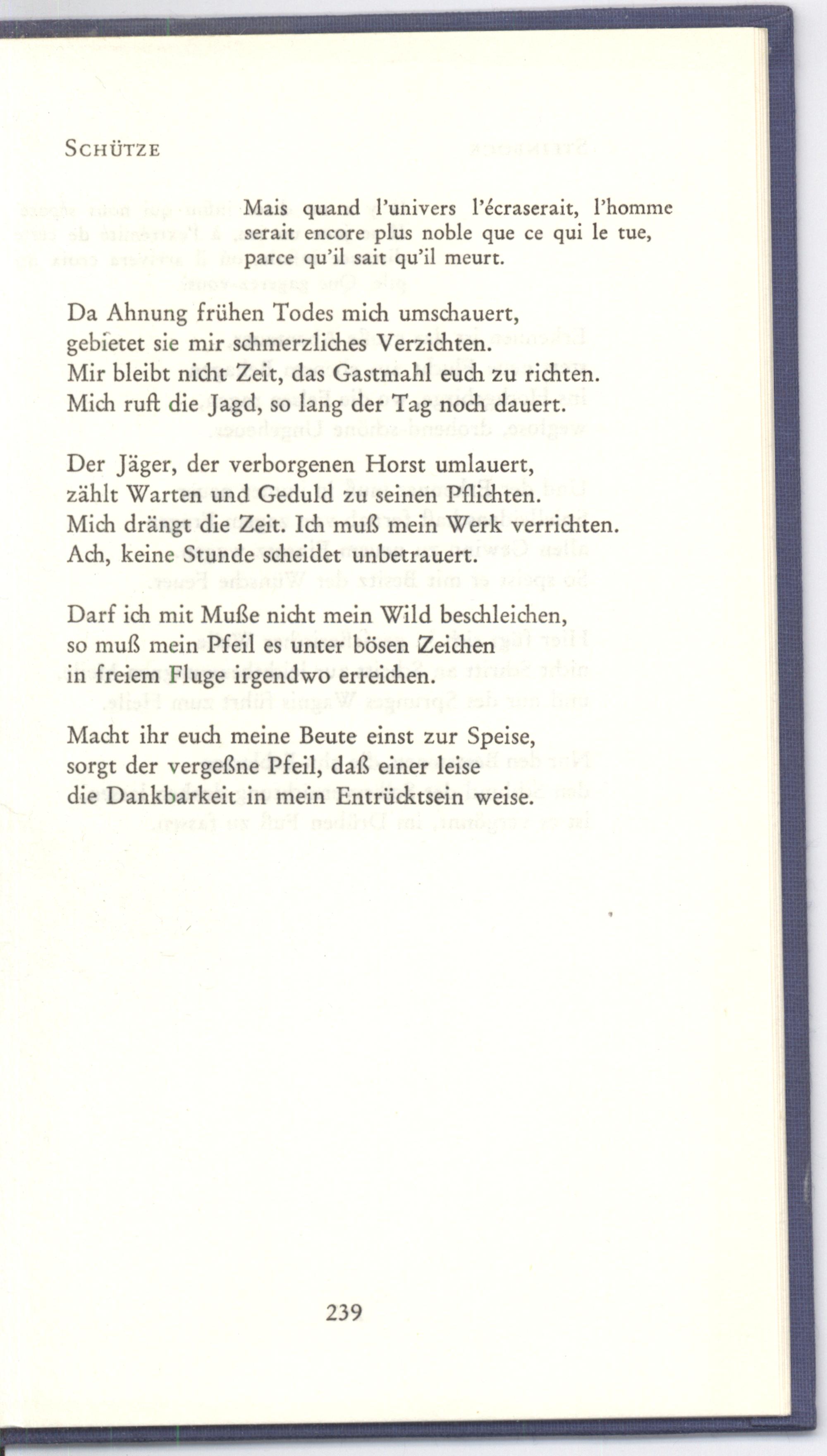 Macht ihr euch meine Beute einst zur Speise, sorgt der vergeßne Pfeil, daß einer leise die Dankbarkeit in mein Entrücktsein weise.