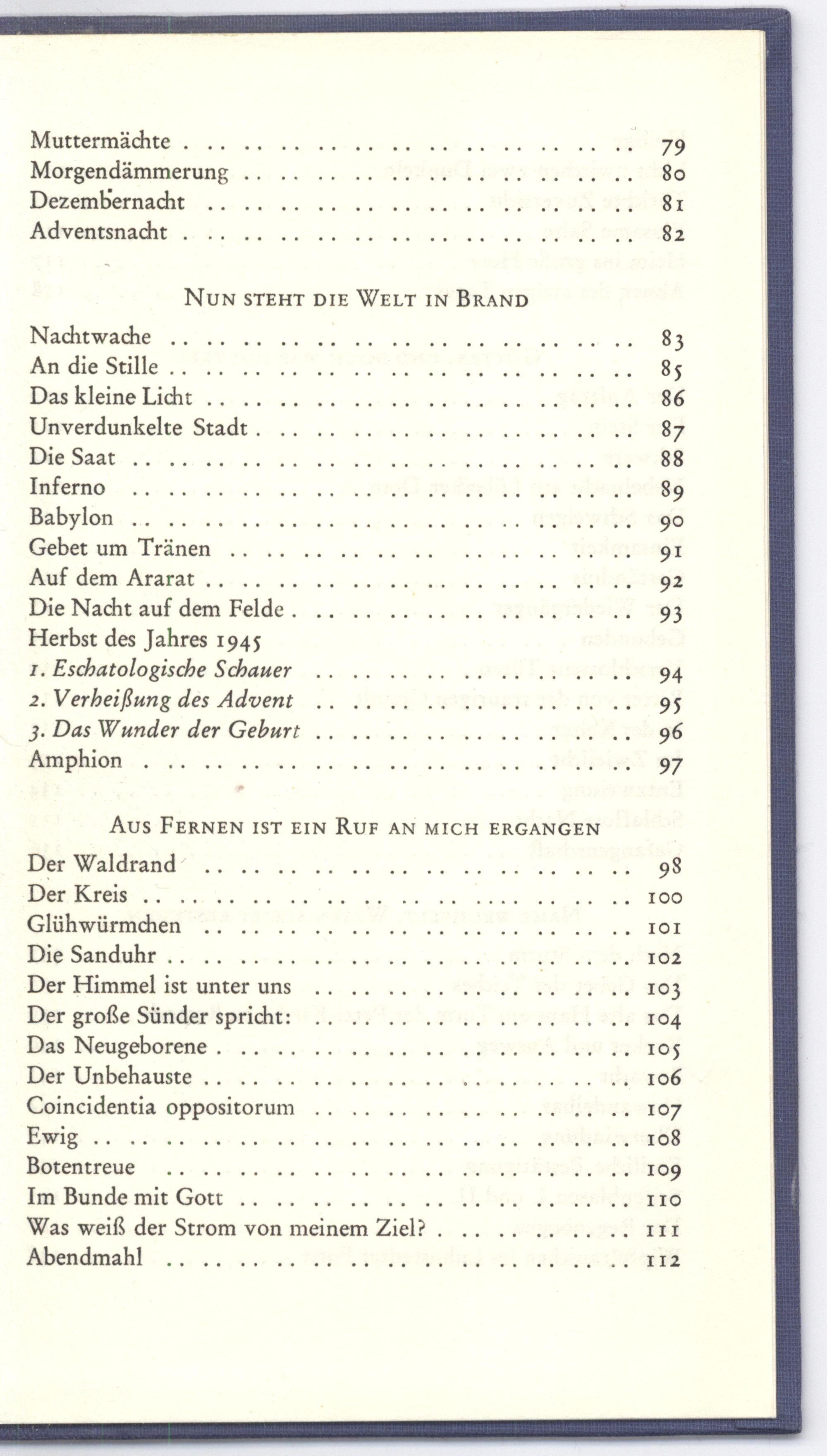 NUN STEHT DIE WELT IN BRAND Nachtwache............ 83 An die Stille.... 85 Das kleine Licht.. 86 Unverdunkelte Stadt. Ks 87 DIE SARt vr ren HU ne 88 Inferno U 89 U ı EN 90 Gebet um Tränen.. 91 Auf dem Ararat v0... 0.00 ve rt ee beta AU 92 Die Nacht auf dem Felde....... 93 Herbst des Jahres 1945 1. Eschatologische Schauer 94 2. Verheißung des Advent JEAN A N 3. Das Wunder der Geburt............ 96 Amphion 97 Aus FERNEN IST EIN RUF AN MICH ERGANGEN