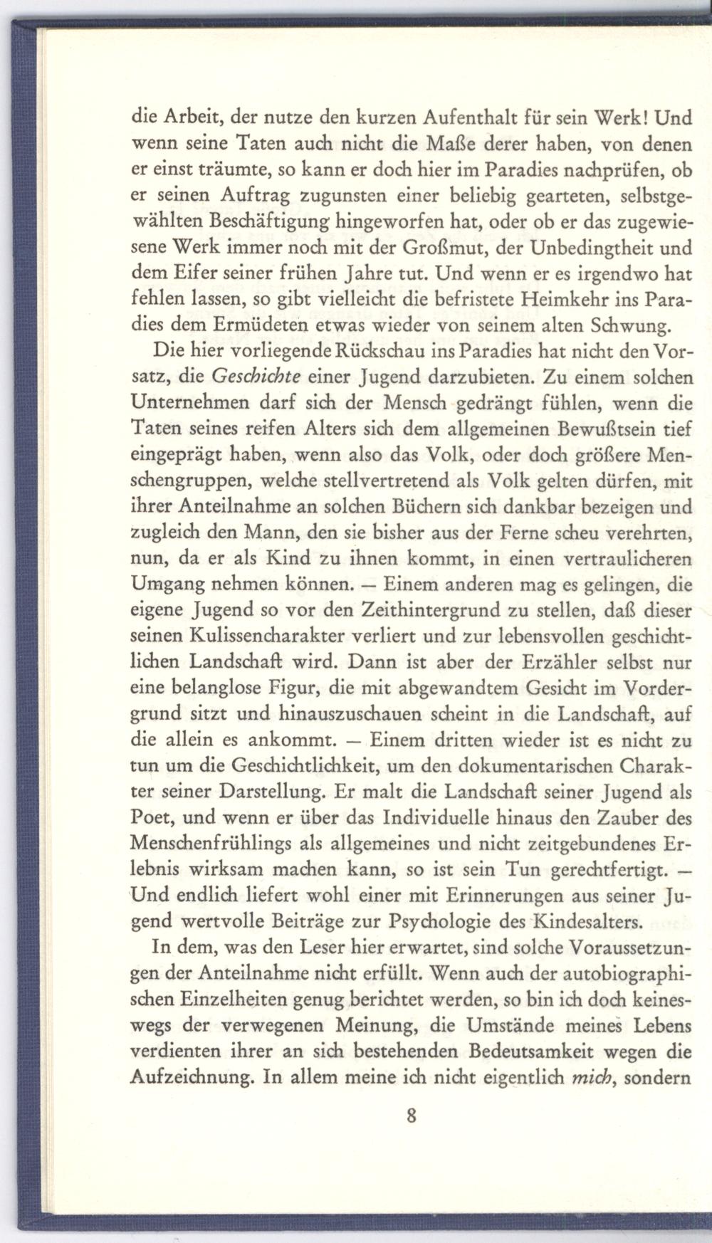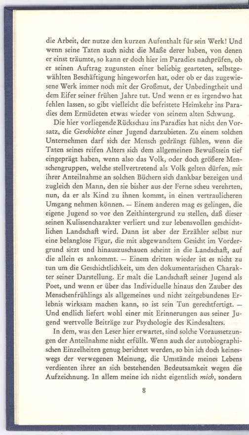 Die hier vorliegende Rückschau ins Paradies hat nicht den Vorsatz, die Geschichte einer Jugend darzubieten. Zu einem solchen Unternehmen darf sich der Mensch gedrängt fühlen, wenn die Taten seines reifen Alters sich dem allgemeinen Bewußtsein tief eingeprägt haben, wenn also das Volk, oder doch größere Menschengruppen, welche stellvertretend als Volk gelten dürfen, mit ihrer Anteilnahme an solchen Büchern sich dankbar bezeigen und zugleich den Mann, den sie bisher aus der Ferne scheu verehrten, nun, da er als Kind zu ihnen kommt, in einen vertraulicheren Umgang nehmen können.— Einem anderen mag es gelingen, die eigene Jugend so vor den Zeithintergrund zu stellen, daß dieser seinen Kulissencharakter verliert und zur lebensvollen geschichtlichen Landschaft wird. Dann ist aber der Erzähler selbst nur eine belanglose Figur, die mit abgewandtem Gesicht im Vordergrund sitzt und hinauszuschauen scheint in die Landschaft, auf die allein es ankommt.— Einem dritten wieder ist es nicht zu tun um die Geschichtlichkeit, um den dokumentarischen Charakter seiner Darstellung. Er malt die Landschaft seiner Jugend als Poet, und wenn er über das Individuelle hinaus den Zauber des Menschenfrühlings als allgemeines und nicht zeitgebundenes Erlebnis wirksam machen kann, so ist sein Tun gerechtfertigt.— Und endlich liefert wohl einer mit Erinnerungen aus seiner Jugend wertvolle Beiträge zur Psychologie des Kindesalters.