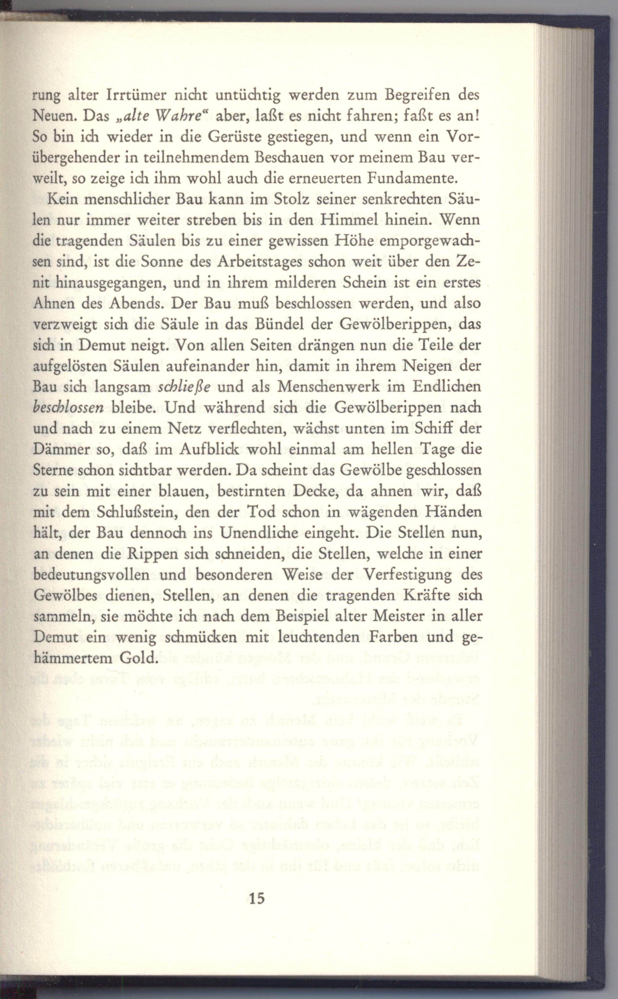 Kein menschlicher Bau kann im Stolz seiner senkrechten Säulen nur immer weiter streben bis in den Himmel hinein. Wenn die tragenden Säulen bis zu einer gewissen Höhe emporgewachsen sind, ist die Sonne des Arbeitstages schon weit über den Zenit hinausgegangen, und in ihrem milderen Schein ist ein erstes Ahnen des Abends. Der Bau muß beschlossen werden, und also verzweigt sich die Säule in das Bündel der Gewölberippen, das sich in Demut neigt. Von allen Seiten drängen nun die Teile der aufgelösten Säulen aufeinander hin, damit in ihrem Neigen der Bau sich langsam schließe und als Menschenwerk im Endlichen beschlossen bleibe. Und während sich die Gewölberippen nach und nach zu einem Netz verflechten, wächst unten im Schiff der Dämmer so, daß im Aufblick wohl einmal am hellen Tage die Sterne schon sichtbar werden. Da scheint das Gewölbe geschlossen zu sein mit einer blauen, bestirnten Decke, da ahnen wir, daß mit dem Schlußstein, den der Tod schon in wägenden Händen hält, der Bau dennoch ins Unendliche eingeht. Die Stellen nun, an denen die Rippen sich schneiden, die Stellen, welche in einer bedeutungsvollen und besonderen Weise der Verfestigung des Gewölbes dienen, Stellen, an denen die tragenden Kräfte sich sammeln, sie möchte ich nach dem Beispiel alter Meister in aller Demut ein wenig schmücken mit leuchtenden Farben und gehämmertem Gold.