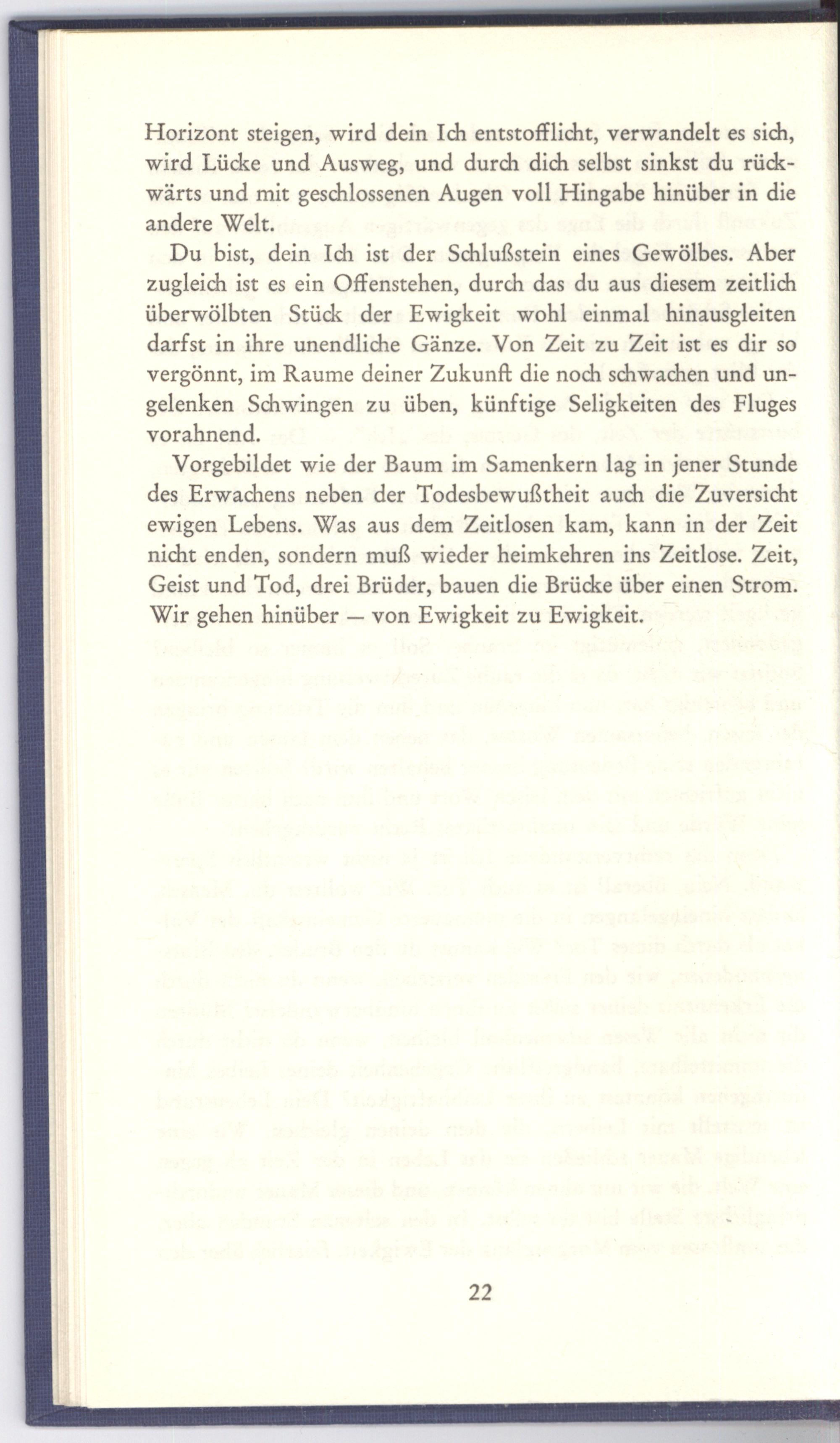 Vorgebildet wie der Baum im Samenkern lag in jener Stunde des Erwachens neben der Todesbewußtheit auch die Zuversicht ewigen Lebens. Was aus dem Zeitlosen kam, kann in der Zeit nicht enden, sondern muß wieder heimkehren ins Zeitlose. Zeit, Geist und Tod, drei Brüder, bauen die Brücke über einen Strom. Wir gehen hinüber— von Ewigkeit zu Ewigkeit.