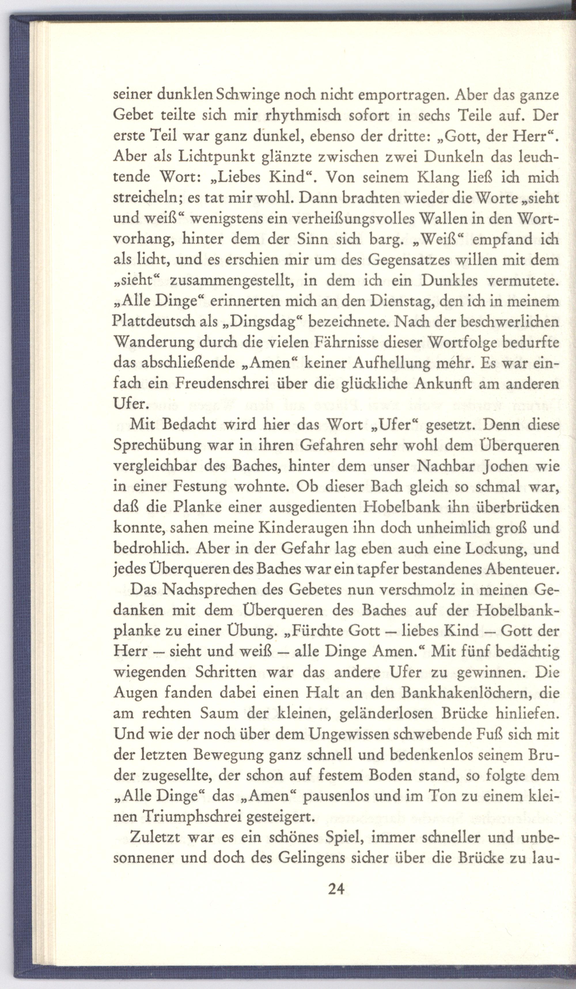 seiner dunklen Schwinge noch nicht emportragen. Aber das ganze Gebet teilte sich mir rhythmisch sofort in sechs Teile auf. Der erste Teil war ganz dunkel, ebenso der dritte:„Gott, der Herr“. Aber als Lichtpunkt glänzte zwischen zwei Dunkeln das leuchtende Wort:„Liebes Kind“, Von seinem Klang ließ ich mich streicheln; es tat mir wohl. Dann brachten wieder die Worte„sieht und weiß“ wenigstens ein verheißungsvolles Wallen in den Wortvorhang, hinter dem der Sinn sich barg.„Weiß“ empfand ich als licht, und es erschien mir um des Gegensatzes willen mit dem „sieht“ zusammengestellt, in dem ich ein Dunkles vermutete. „Alle Dinge“ erinnerten mich an den Dienstag, den ich in meinem Plattdeutsch als„Dingsdag“ bezeichnete. Nach der beschwerlichen Wanderung durch die vielen Fährnisse dieser Wortfolge bedurfte das abschließende„Amen“ keiner Aufhellung mehr. Es war einfach ein Freudenschrei über die glückliche Ankunft am anderen Ufer.