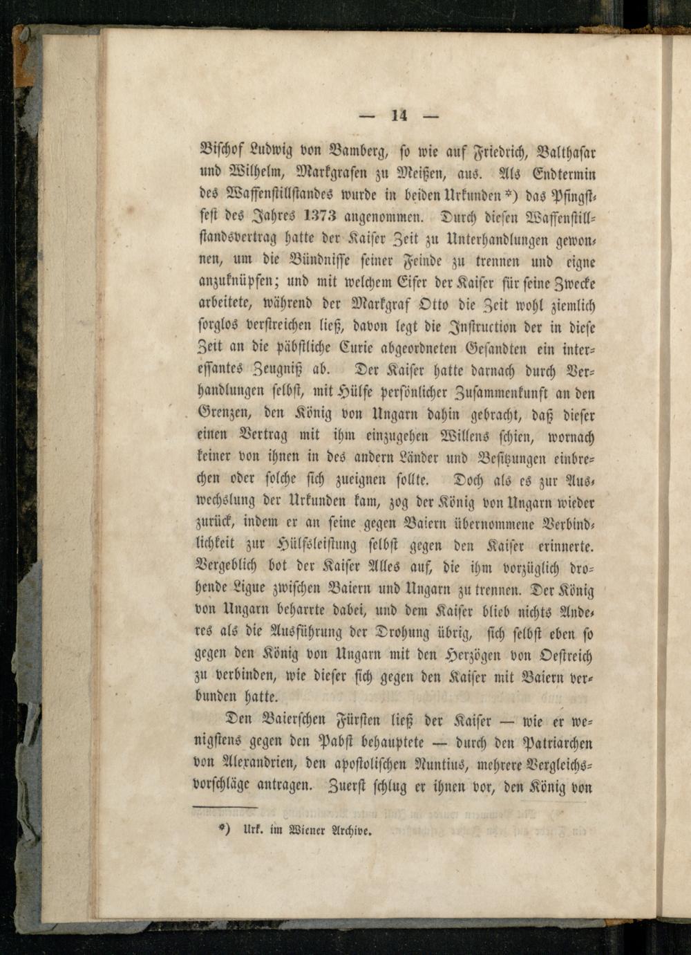 Biſchof Ludwig von Bamberg, ſo wie auf Friedrich, Balthaſar und Wilhelm, Markgrafen zu Meißen, aus. Als Endtermin des Waffenſtillſtandes wurde in beiden Urkunden 3) das Pfingſtfeſt des Jahres 1373 angenommen. Durch dieſen Waffenſtillſtandsvertrag hatte der Kaiſer Zeit zu Unterhandlungen gewonnen, um die Bündniſſe ſeiner Feinde zu trennen und eigne anzuknüpfen; und mit welchem Eifer der Kaiſer für ſeine Zwecke arbeitete, während der Markgraf Otto die Zeit wohl ziemlich ſorglos verſtreichen ließ, davon legt die Inſtruction der in dieſe Zeit an die päbſtliche Curie abgeordneten Geſandten ein inter— eſſantes Zeugniß ab. Der Kaiſer hatte darnach durch Ver— handlungen ſelbſt, mit Hülfe perſönlicher Zuſammenkunft an den Grenzen, den König von Ungarn dahin gebracht, daß dieſer einen Vertrag mit ihm einzugehen Willens ſchien, wornach keiner von ihnen in des andern Länder und Beſitzungen einbre— chen oder ſolche ſich zueignen ſollte. Doch als es zur Aus— wechslung der Urkunden kam, zog der König von Ungarn wieder zurück, indem er an ſeine gegen Baiern übernommene Verbind— lichkeit zur Hülfsleiſtung ſelbſt gegen den Kaiſer erinnerte. Vergeblich bot der Kaiſer Alles auf, die ihm vorzüglich dro— hende Ligue zwiſchen Baiern und Ungarn zu trennen. Der König von Ungarn beharrte dabei, und dem Kaiſer blieb nichts Ande— res als die Ausführung der Drohung übrig, ſich ſelbſt eben ſo gegen den König von Ungarn mit den Herzögen von Oeſtreich zu verbinden, wie dieſer ſich gegen den Kaiſer mit Baiern ver— bunden hatte.