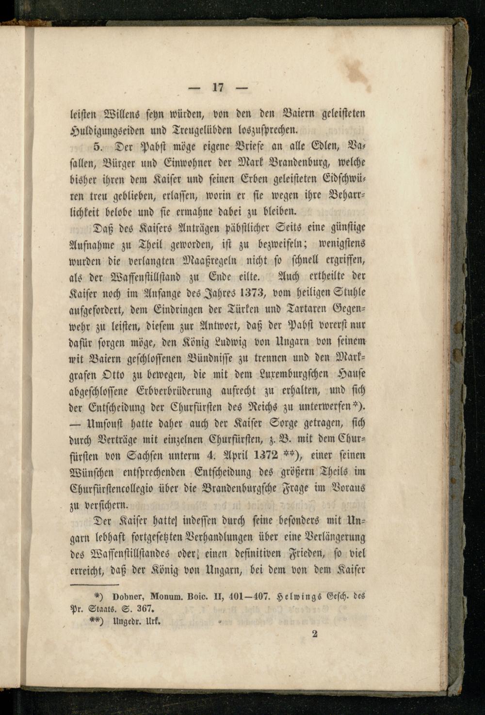 Daß des Kaiſers Anträgen päbſtlicher Seits eine günſtige Aufnahme zu Theil geworden, iſt zu bezweifeln; wenigſtens wurden die verlangten Maaßregeln nicht ſo ſchnell ergriffen, als der Waffenſtillſtand zu Ende eilte. Auch ertheilte der Kaiſer noch im Anfange des Jahres 1373, vom heiligen Stuhle aufgefordert, dem Eindringen der Türken und Tartaren Gegenwehr zu leiſten, dieſem zur Antwort, daß der Pabſt vorerſt nur dafür ſorgen möge, den König Ludwig von Ungarn von ſeinem wit Baiern geſchloſſenen Bündniſſe zu trennen und den Marks grafen Otto zu bewegen, die mit dem Luxemburgſchen Haufe abgeſchloſſene Erbverbrüderung aufrecht zu erhalten, und ſich der Entſcheidung der Churfürſten des Reichs zu unterwerfen*). — Umſouſt hatte daher auch der Kaiſer Sorge getragen, ſich durch Verträge mit einzelnen Churfürſten, z. B. mit dem Churz fürſten von Sachſen unterm 4. April 1372**), einer feinen Wünſchen entſprechenden Entſcheidung des größern Theils im Churfürſtencollegio über die Brandenburgſche Frage im Voraus zu verſichern.