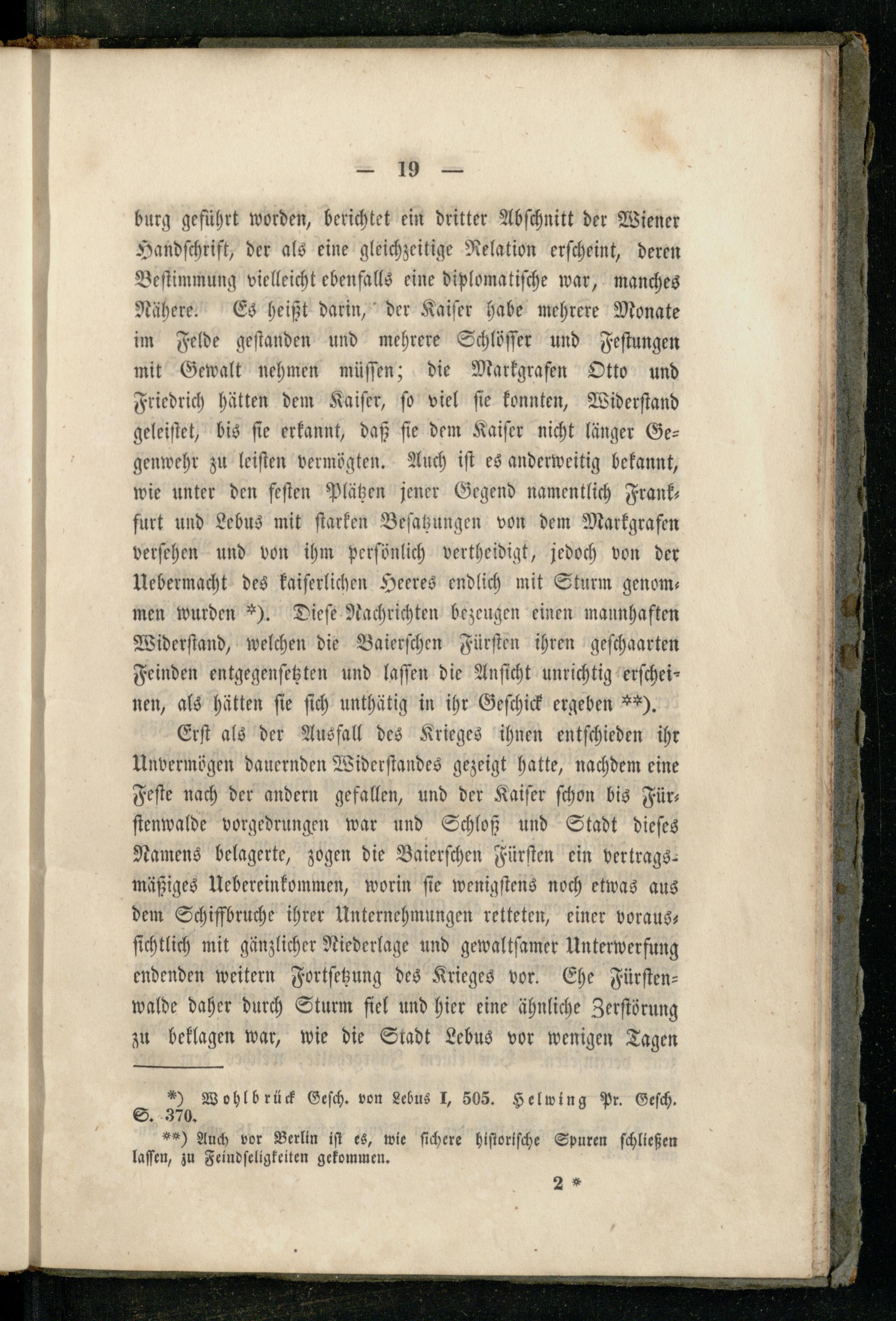 burg geführt worden, berichtet ein dritter Abſchnitt der Wiener Handſchrift, der als eine gleichzeitige Relation erſcheint, deren Beſtimmung vielleicht ebenfalls eine diplomatiſche war, manches Nähere. Es heißt darin, der Kaiſer habe mehrere Monate im Felde geſtanden und mehrere Schlöſſer und Feſtungen mit Gewalt nehmen müſſen; die Markgrafen Otto und Friedrich hätten dem Kaiſer, ſo viel ſie konnten, Widerſtand geleiſtet, bis fie erkannt, daß fie dem Kaiſer nicht länger Gegenwehr zu leiſten vermögten. Auch iſt es anderweitig bekannt, wie unter den feſten Plätzen jener Gegend namentlich Frank furt und Lebus mit ſtarken Beſatzungen von dem Markgrafen verſehen und von ihm perſönlich vertheidigt, jedoch von der Uebermacht des kaiſerlichen Heeres endlich mit Sturm genom— men wurden*). Dieſe Nachrichten bezeugen einen maunhaften Widerſtand, welchen die Baierſchen Fürſten ihren geſchaarten Feinden entgegenſetzten und laſſen die Anſicht unrichtig erſcheinen, als hätten ſie ſich unthätig in ihr Geſchick ergeben**). Erſt als der Ausfall des Krieges ihnen entſchieden iht Unvermögen dauernden Widerſtandes gezeigt hatte, nachdem eine Feſte nach der andern gefallen, und der Kaiſer ſchon bis Für— ſtenwalde vorgedrungen war und Schloß und Stadt dieſes Namens belagerte, zogen die Baierſchen Fürſten ein vertrags— mäßiges Uebereinkommen, worin ſie wenigſtens noch etwas aus dem Schiffbruche ihrer Unternehmungen retteten, einer voraus— ſichtlich mit gänzlicher Niederlage und gewaltſamer Unterwerfung endenden weitern Fortſetzung des Krieges vor. Ehe Fürſtenwalde daher durch Sturm ſiel und hier eine ähnliche Zerſtörung zu beklagen war, wie die Stadt Lebus vor wenigen Tagen