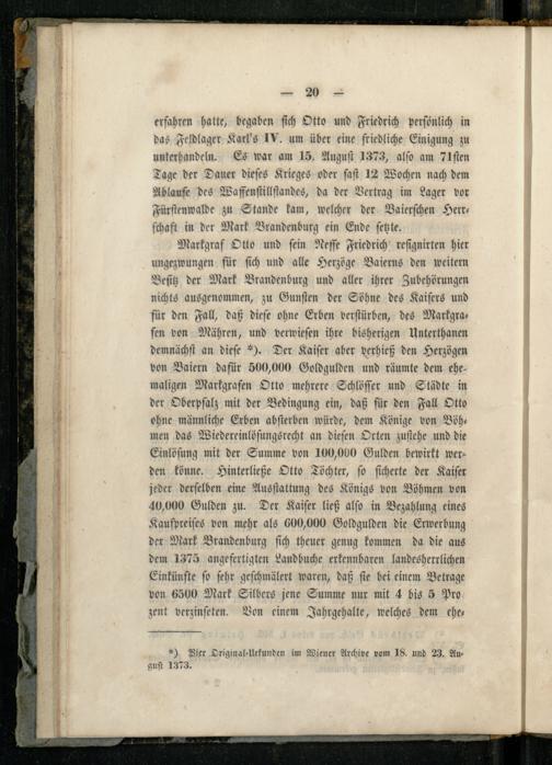 erfahren hatte, begaben ſich Otto und Friedrich perſönlich in das Feldlager Karl's IV. um über eine friedliche Einigung zu unterhandeln. Es war am 15. Auguſt 1373, alſo am 71Iſten Tage der Dauer dieſes Krieges oder faſt 12 Wochen nach dem Ablaufe des Waffenſtillſtandes, da der Vertrag im Lager vor Fürſtenwalde zu Stande kam, welcher der Baierſchen Herr— ſchaft in der Mark Brandenburg ein Ende ſetzte.