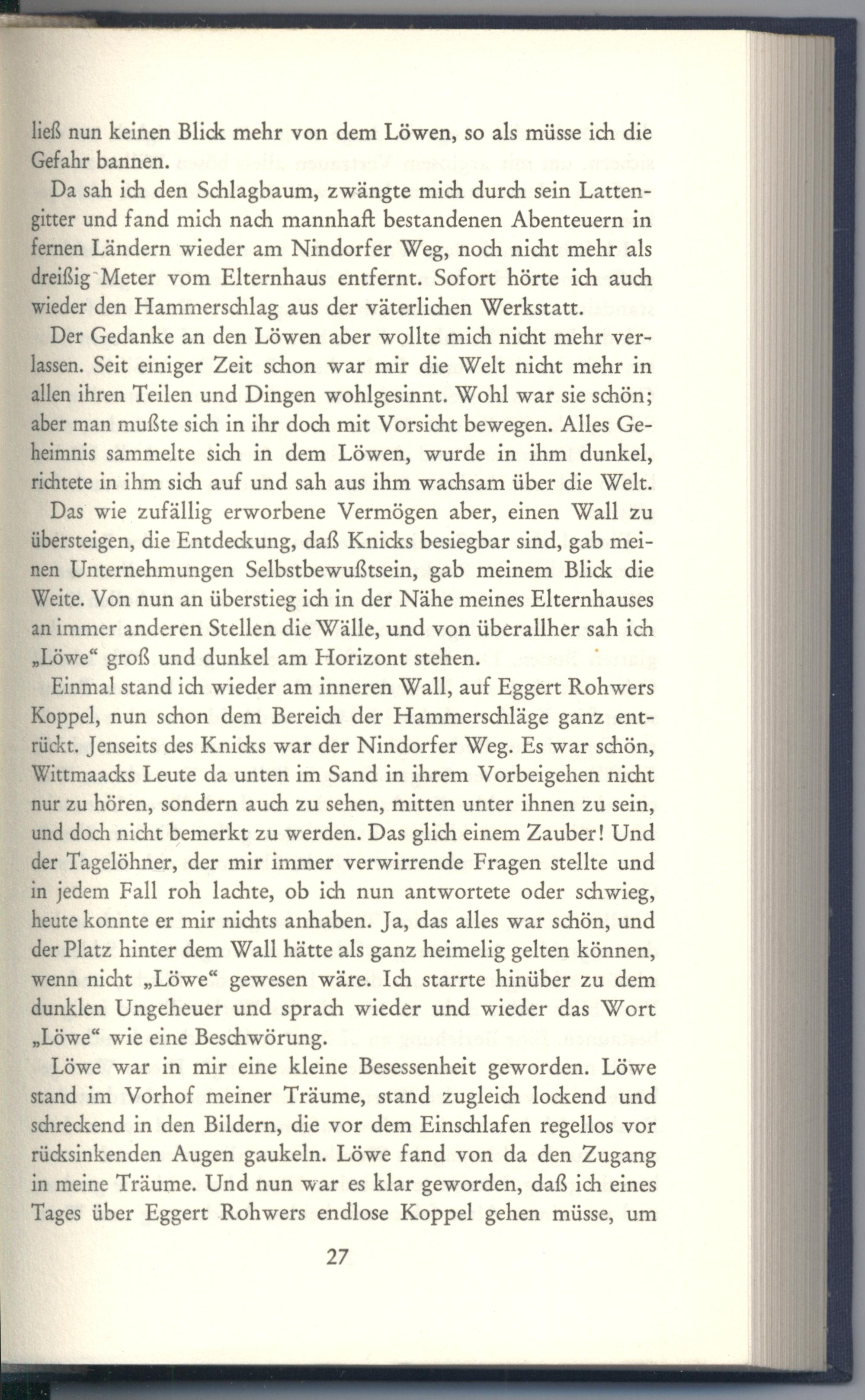 Das wie zufällig erworbene Vermögen aber, einen Wall zu übersteigen, die Entdeckung, daß Knicks besiegbar sind, gab meinen Unternehmungen Selbstbewußtsein, gab meinem Blick die Weite. Von nun an überstieg ich in der Nähe meines Elternhauses __ an immer anderen Stellen die Wälle, und von überallher sah ich „Löwe“ groß und dunkel am Horizont stehen.