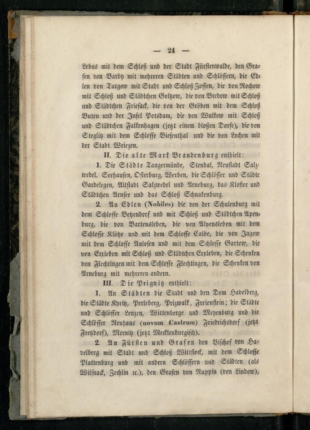 1. An Städten die Stadt und den Dom Havelberg, die Städte Kyritz, Perleberg, Prizwalk, Freienſtein; die Städte und Schlöſſer Lenzen, Wittenberge und Meyenburg und die Schlöſſer Neuhaus(novum Castrum) Friedrichsdorf(jetzt Fretzdorf), Mernitz(jetzt Mecklenburgiſch).